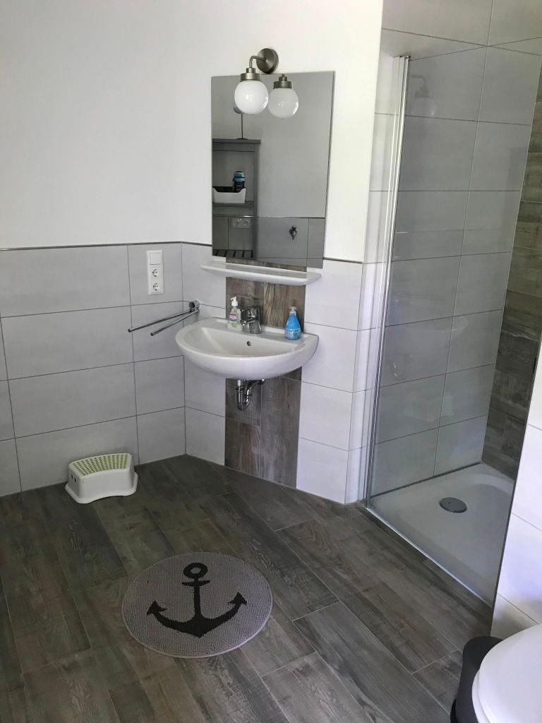 Das großzügige Badezimmer mit großer begehbarer Dusche rundet den Komfort ab.