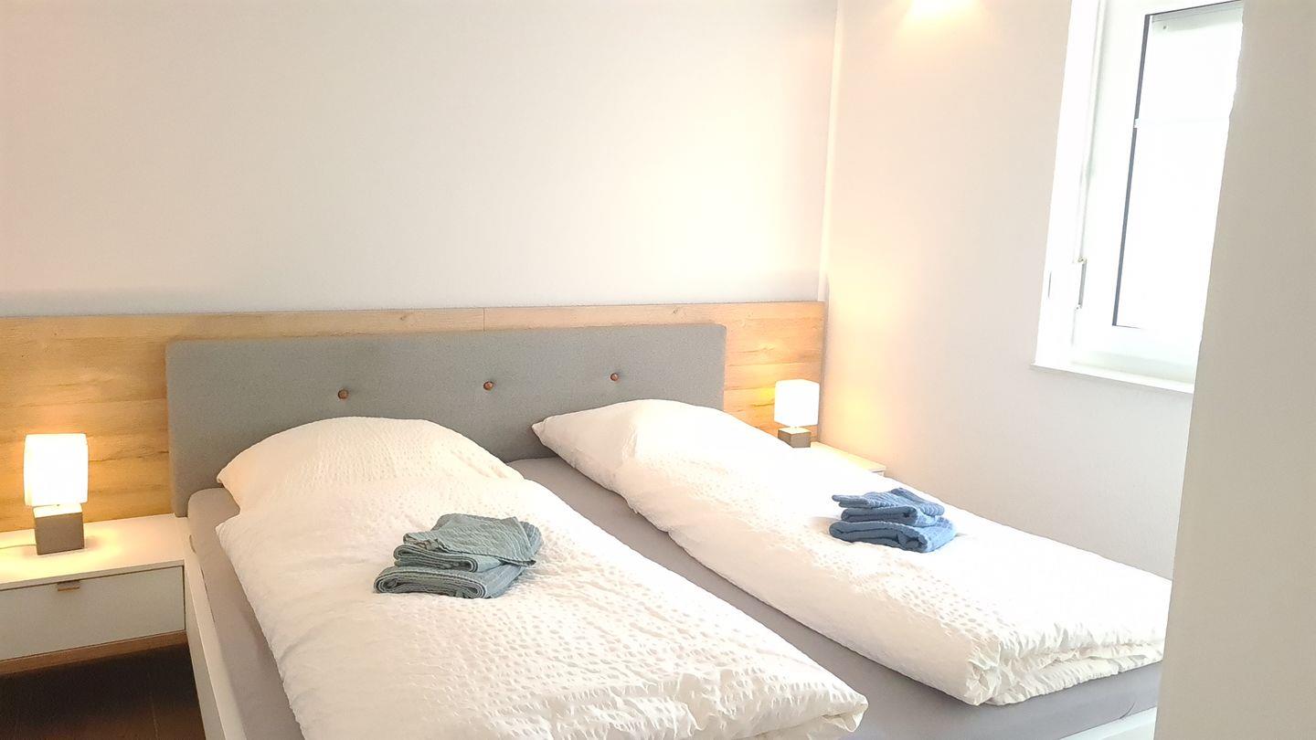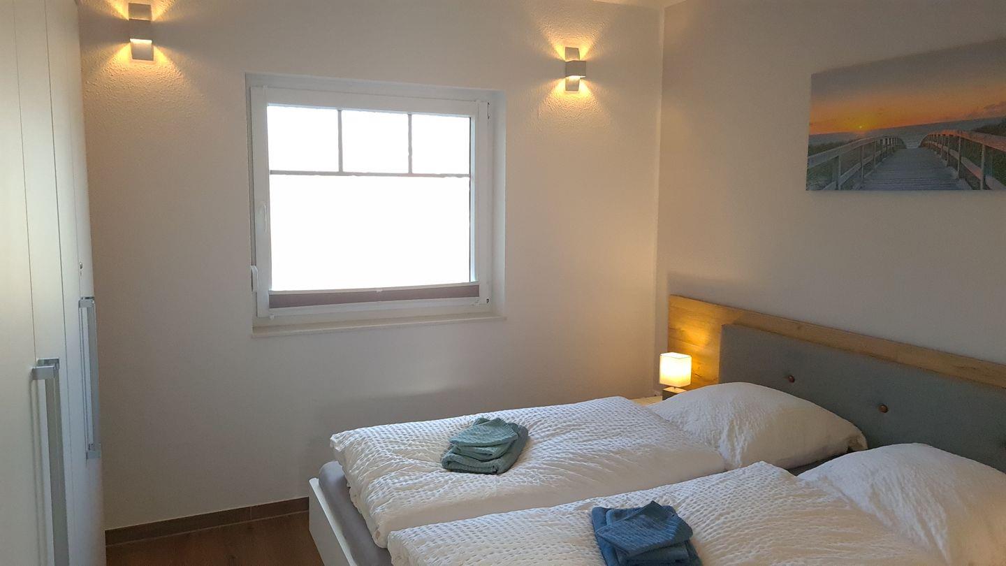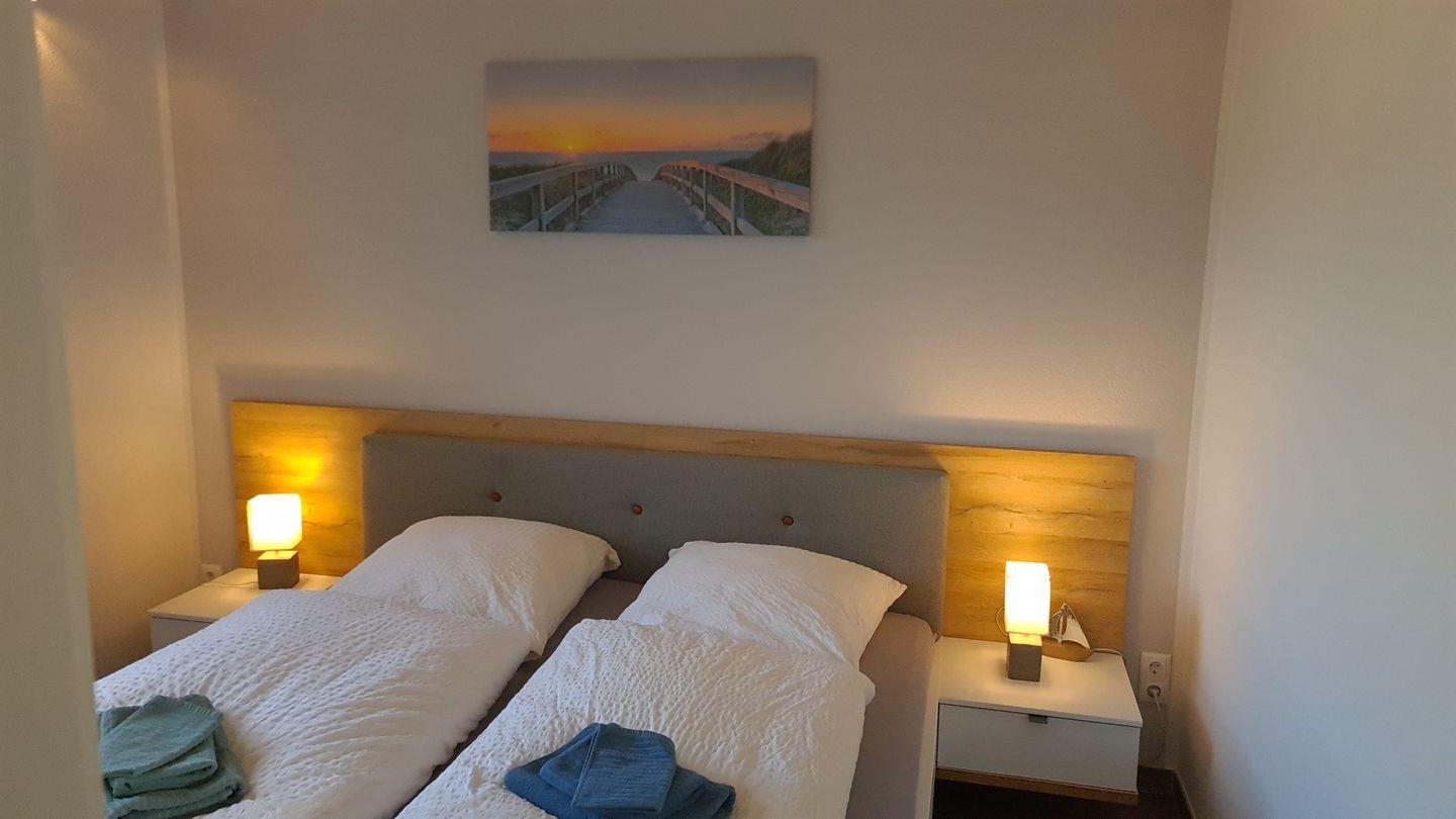 Ein Schlafzimmer ist mit zwei Einzelbetten und einem Kleiderschrank ausgestattet, die beiden anderen bieten jeweils ein geräumiges Doppelbett und Kleiderschrank.