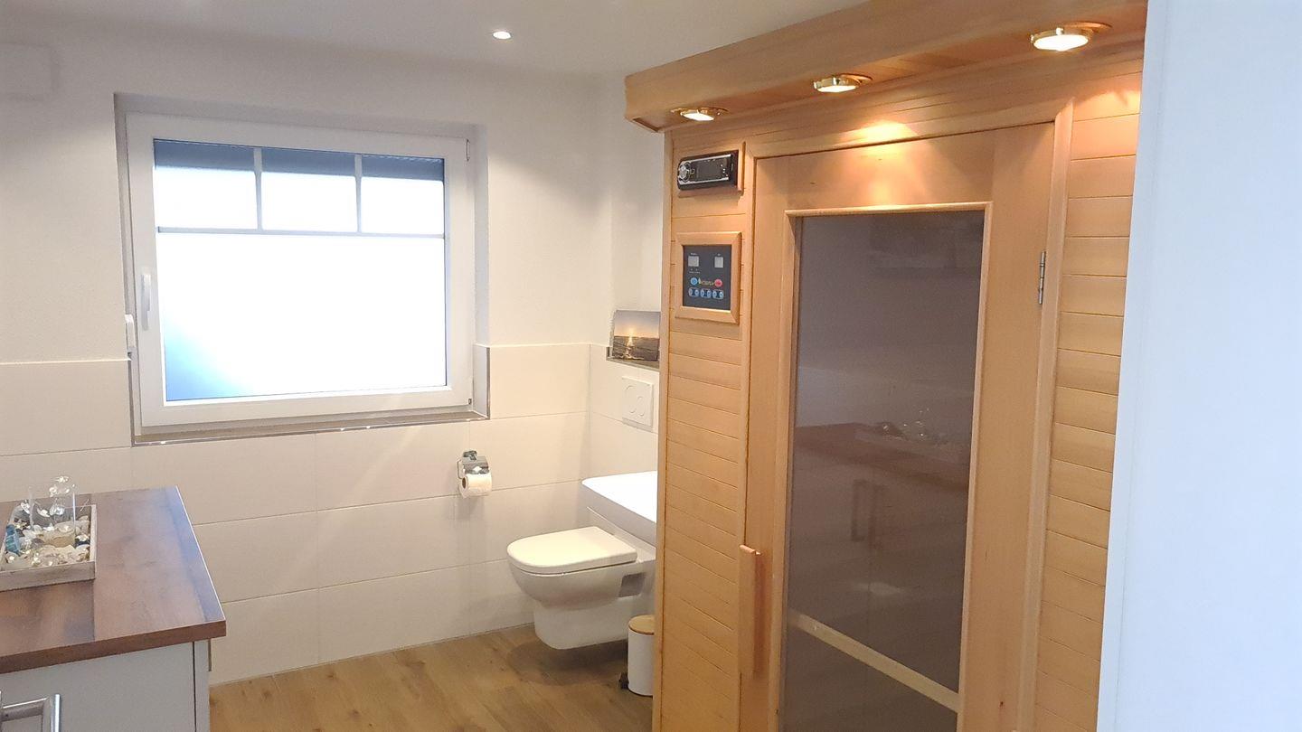 Das luxuriöse Hauptbad verfügt über eine große Walk-In-Dusche und eine entspannende Infrarotsauna, ergänzt durch ein praktisches Gäste-WC.