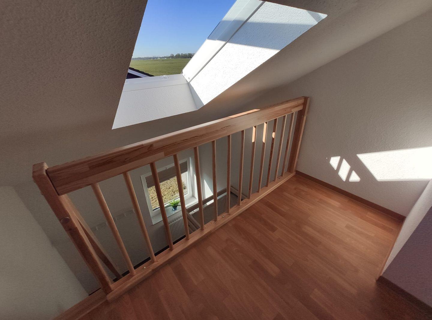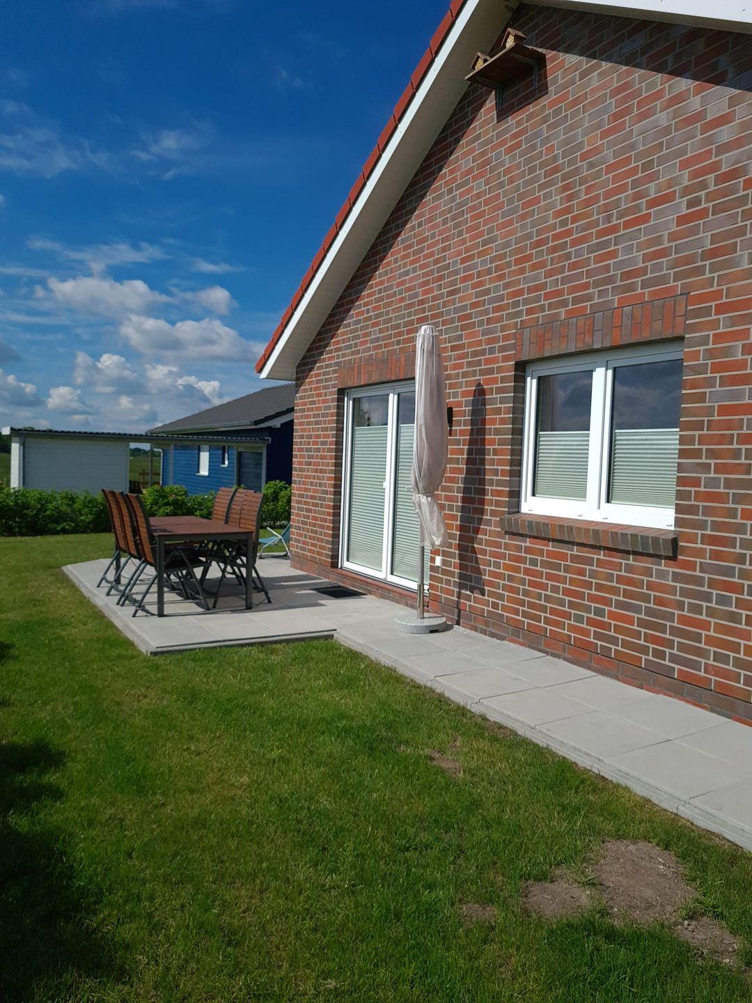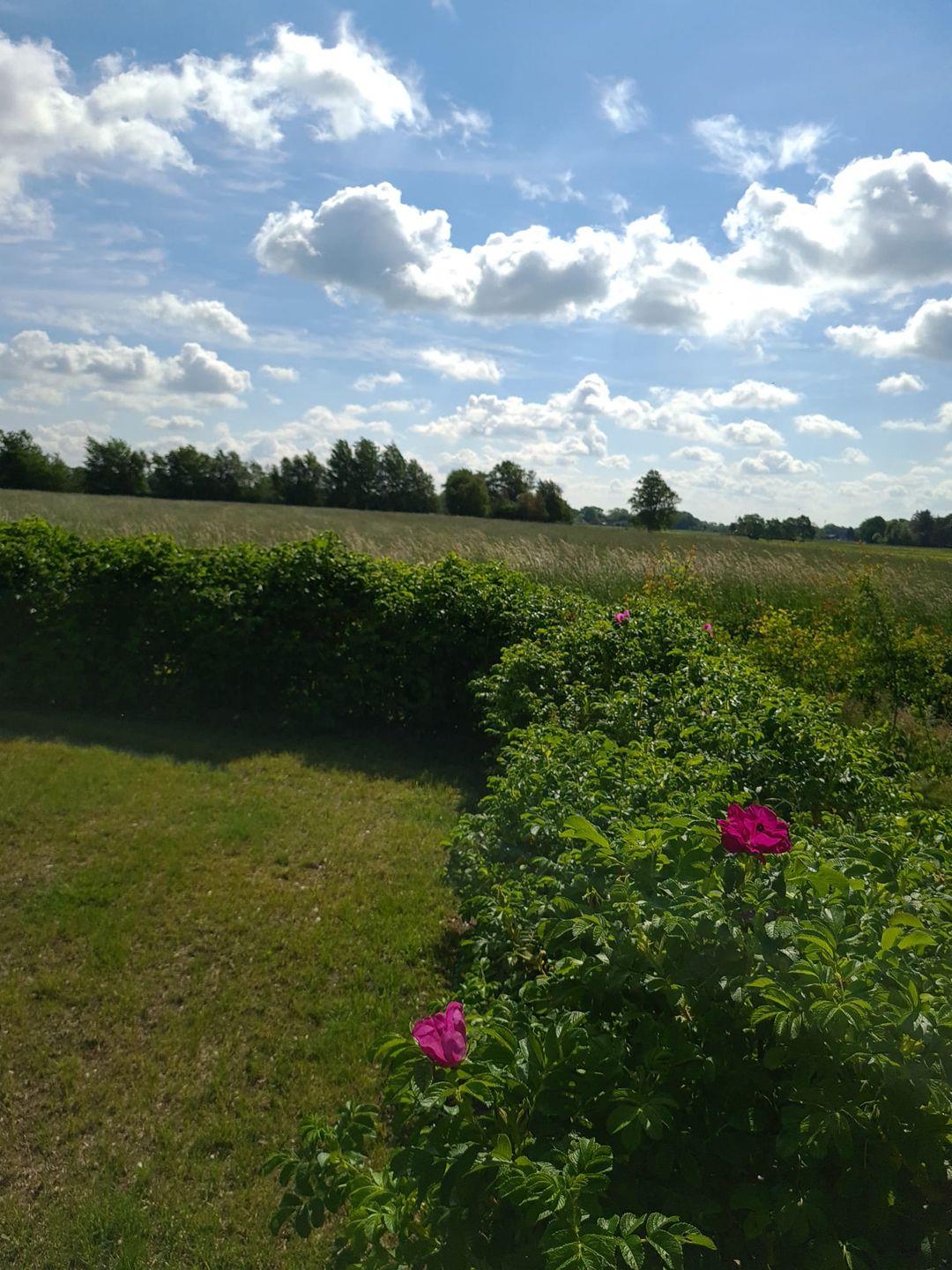 Von der Südost-Terrasse auf dem 400 qm Grundstück, das von Heckenrosen eingegrenzt ist, ist ein freier Blick auf die Wiesen mit Pferden, Kühen und auch den Rehen, aber auch zu Falken, Fasanen und Feldhasen möglich.