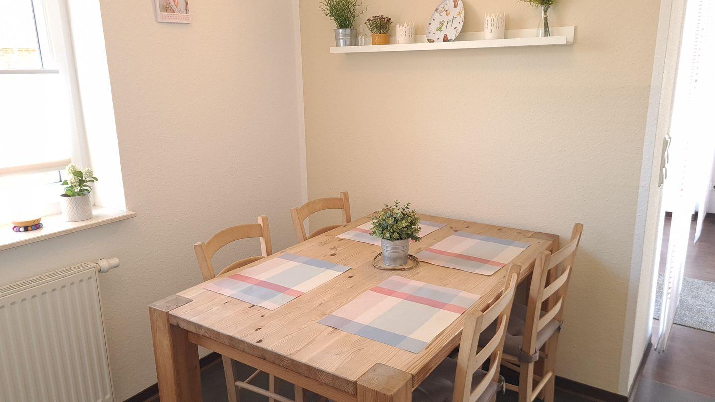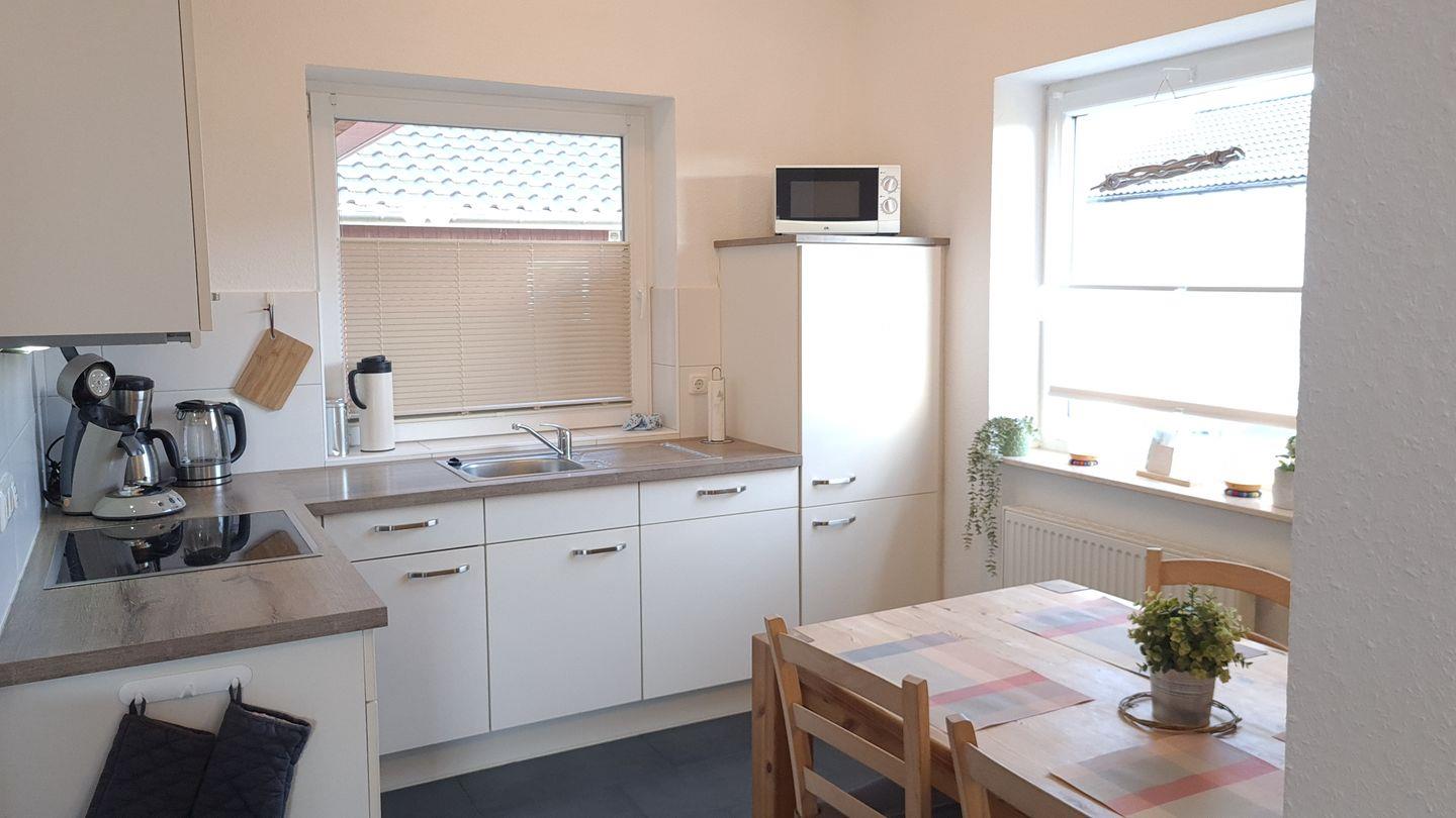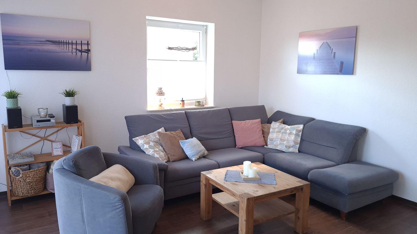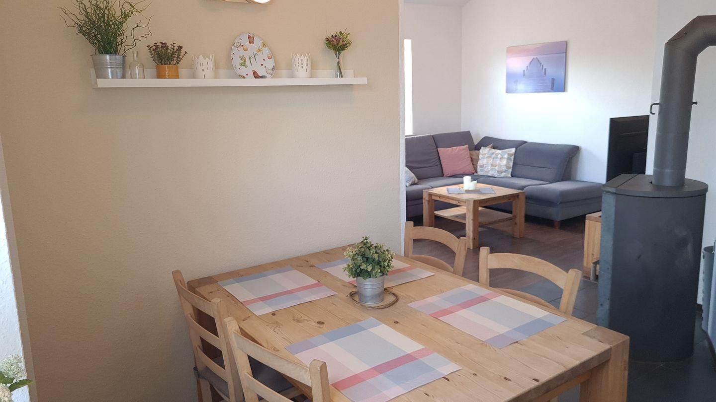 Das geschmackvoll eingerichtete, barrierearme Ferienhaus (ca. 70 m²) empfängt Sie mit einem hellen Flur. Der offene Wohnbereich mit gemütlichem Wohnzimmer (Schlafcouch für 2 Personen), komplett ausgestatteter Küche (Esstisch für 5 Personen, Kinderstuhl) und Kamin lädt zum Verweilen ein. Von hier aus gelangen Sie direkt auf die möblierte Terrasse.