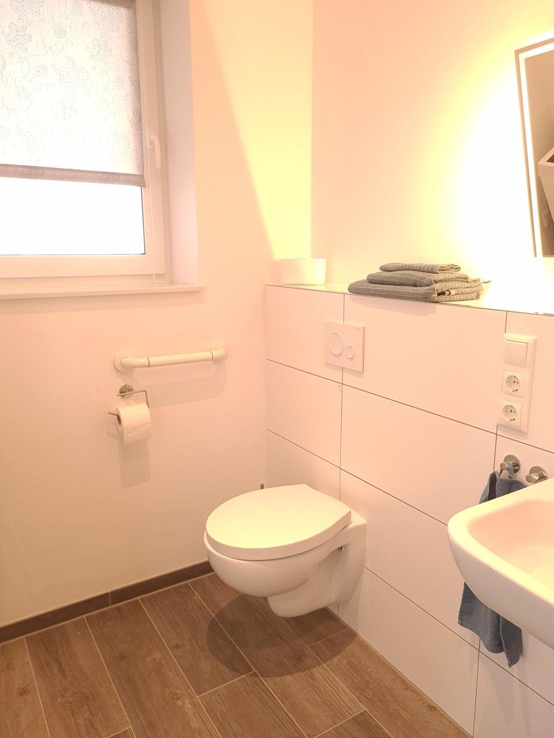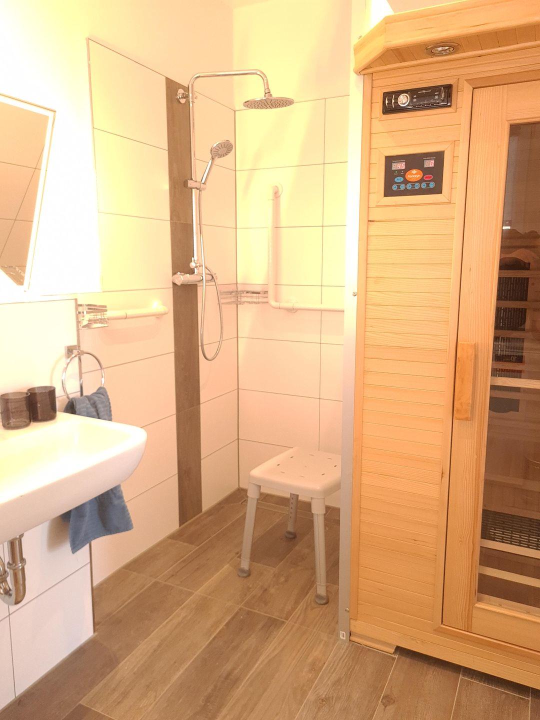 Das Wieken-Huus bietet besonders Menschen mit Gehbehinderung eine gute Grundausstattung. Schwellenlosen Zugang zur Haustür und Terrasse. Alle Türen sind 100cm breit, das Bad verfügt über eine ebenerdige Dusche mit Duschhocker und 2 Haltegriffen. Auch neben der Toilette befindet sich ein Griff. Der Spiegel ist gekippt, somit ist das Frisieren im Sitzen kein Problem. Im Bad befindet sich eine Infrarotsauna, die Badzimmertür geht zur Sicherheit nach außen auf. Waschmaschine, Trockner, Wäscheständer und Bügeleisen sind ebenfalls vorhanden. Zu Ihrer Sicherheit sind Rauchmelder, sowie ein Feuerlöscher installiert, der Erste-Hilfe-Koffer ist vorhanden.