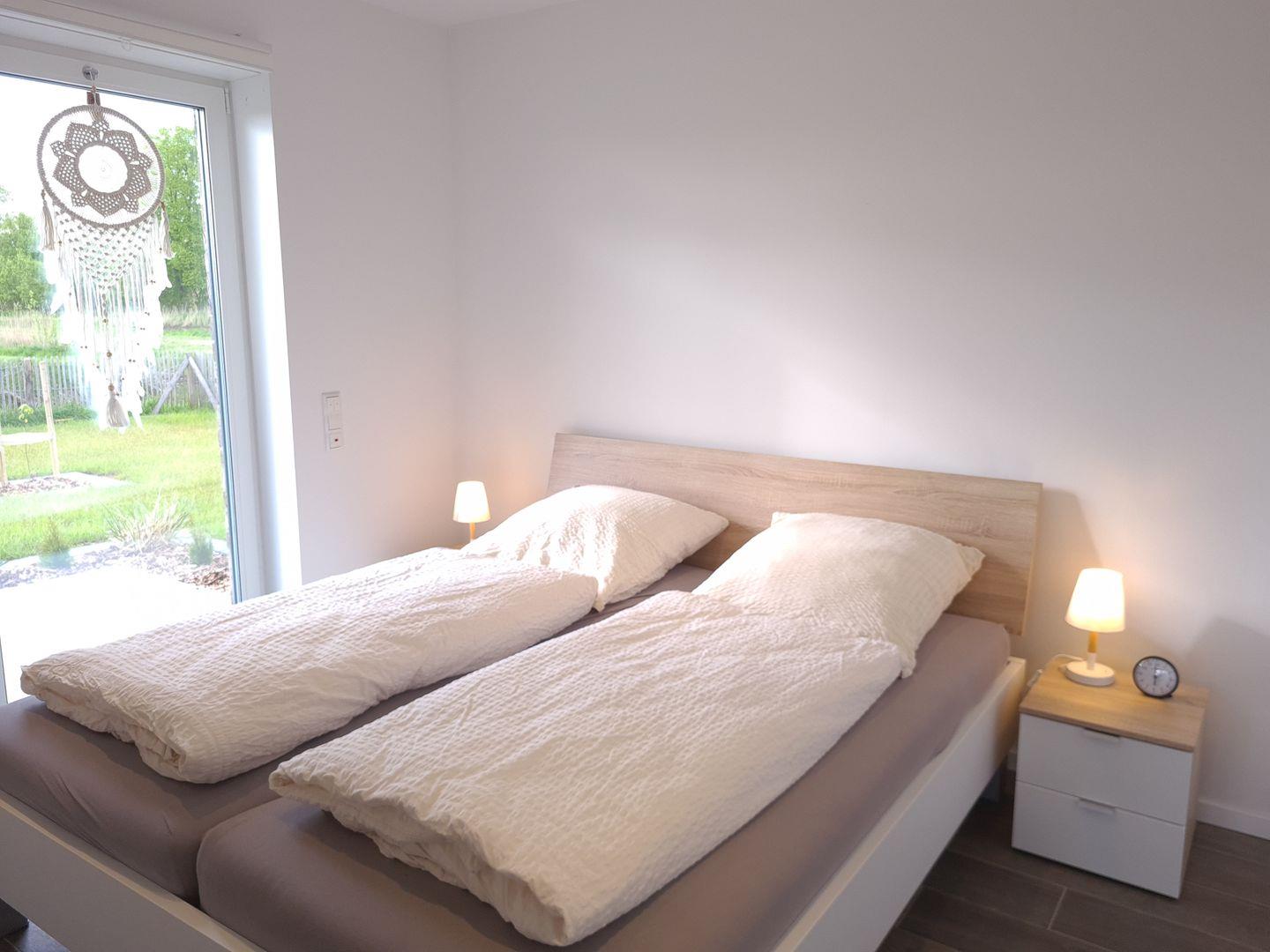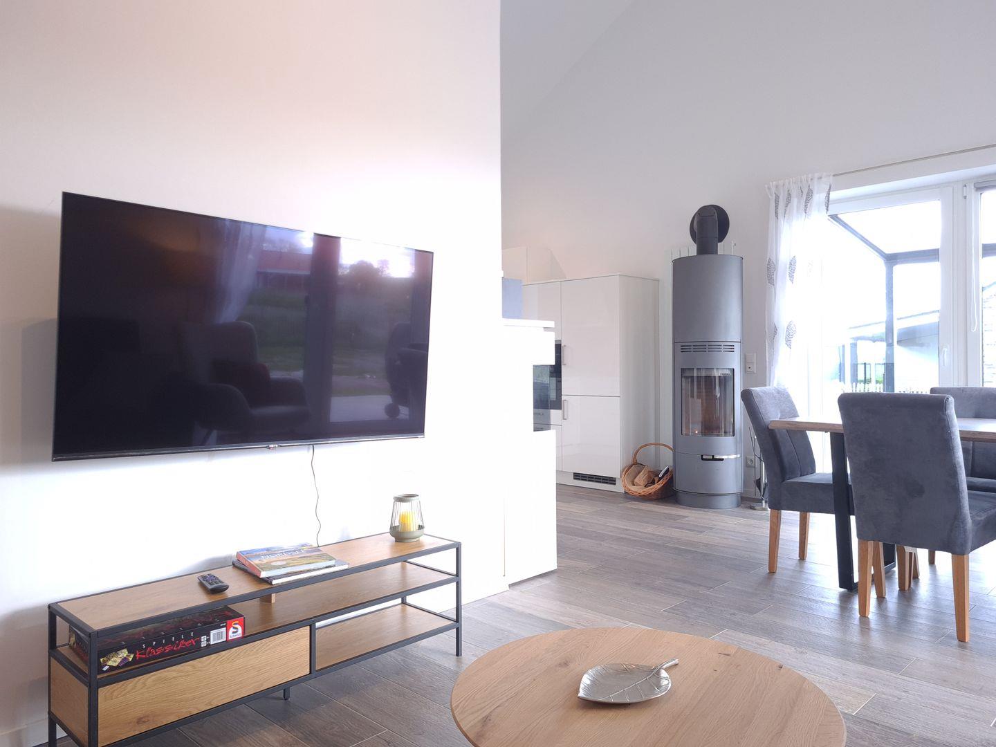 Das Wohnzimmer ist mit Sofa und Lesesessel gemütlich eingerichtet und verfügt über einen Smart-TV und eine Stereoanlage. Der Essbereich bietet Platz für 6 Personen an einem großen Tisch mit bequemen Stühlen. An kühlen Abenden können Sie den modernen Kaminofen nutzen. Es gibt zwei Schlafzimmer, von denen eines rollstuhlgerecht ist. In einem Schlafraum steht im unteren Bereich ein Doppelbett, ein Fernseher ist an der gegenüberliegenden Wand angebracht. Eine kleine geschlossene Holztreppe (Kindersicher mit Törchen) führt nach oben in die Dachgalerie. In dem Bereich sind zwei Einzelbetten optimal als ganz eigener Schlaf-und Spielbereich für Kinder.