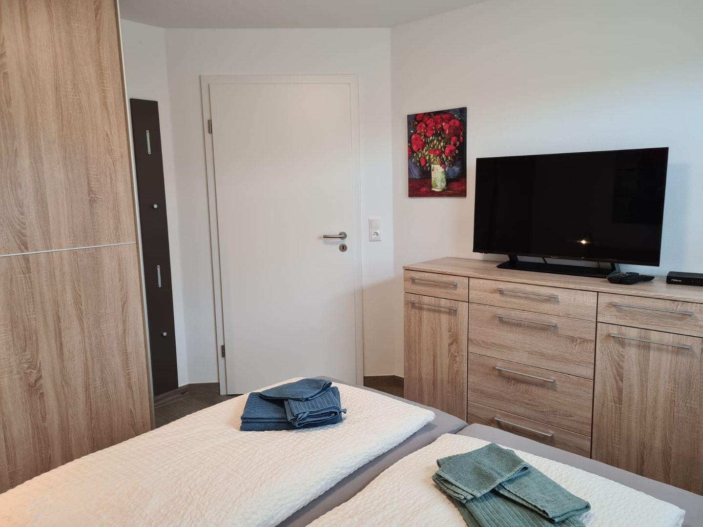 Im Hauptschlafzimmer befindet sich ein Doppelbett (160x200), Kleiderschrank und TV. Das weitere Schlafzimmer verfügt über zwei Einzelbetten und einen kleinen Kleiderschrank. Alle Schlafzimmer und der Wohnbereich lassen sich über elektrische Rollläden verdunkeln.