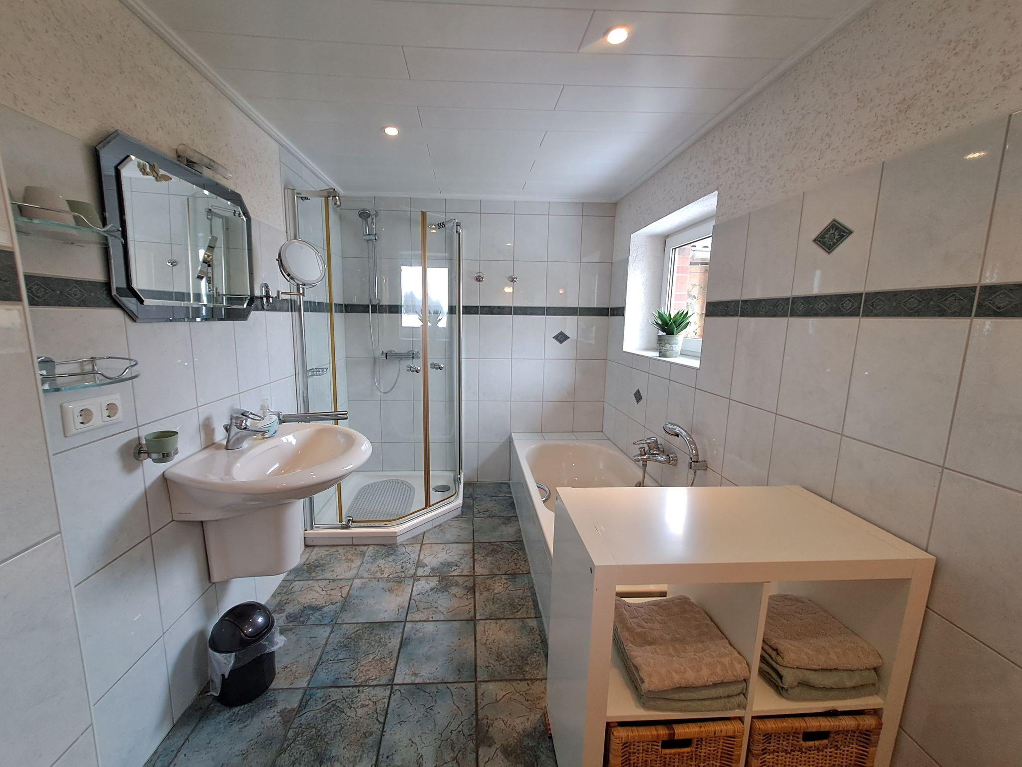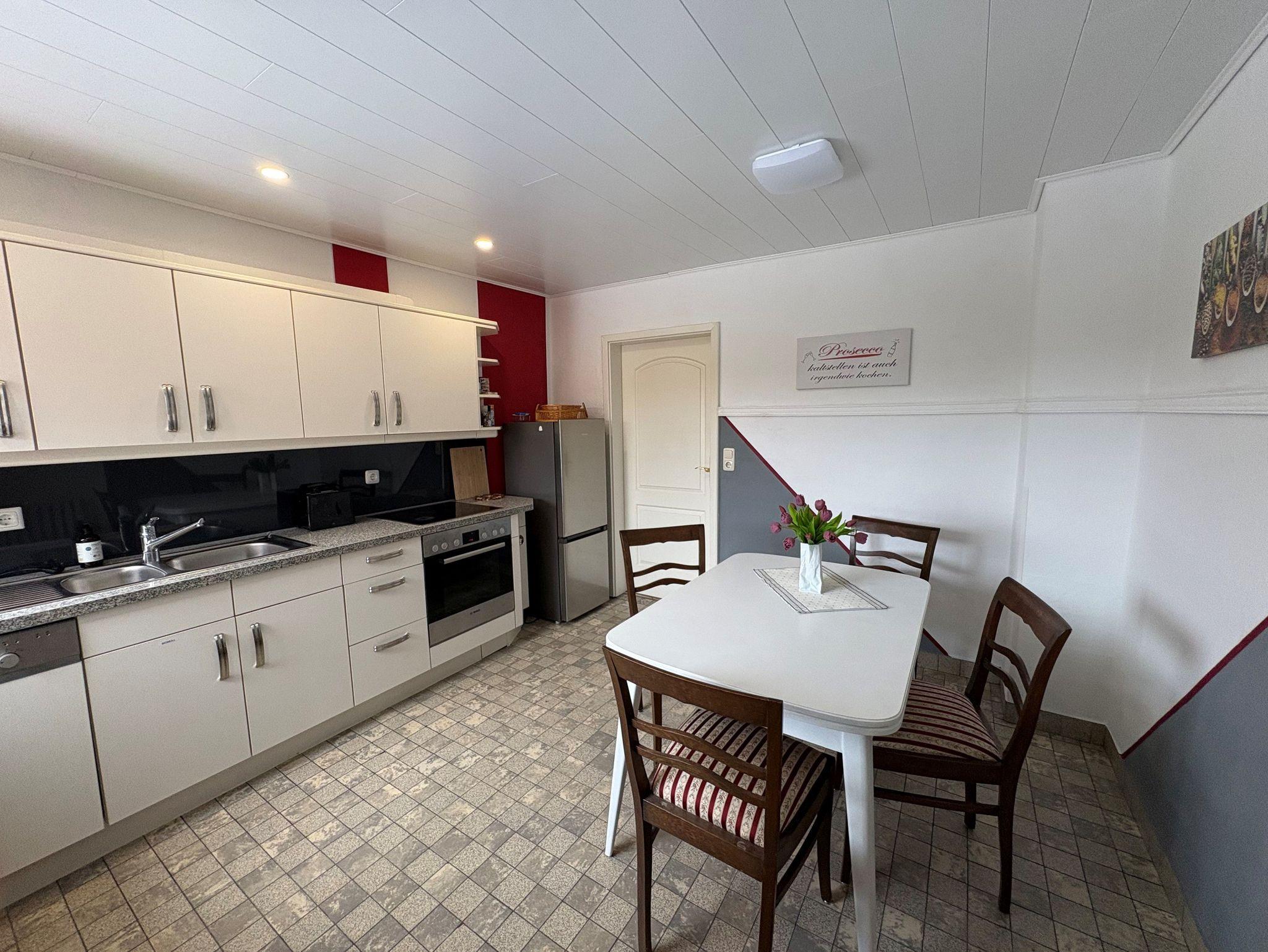 Weiterhin verfügt die Unterkunft über eine großzügige und gut ausgestattete Küche mit Esstisch. Das Badezimmer hält sowohl eine Dusche als auch eine Badewanne bereit und ist für alle Gäste unanbhängig voneinander über den Flur zugänglich. Ebenfalls wird den Gästen sowohl eine Waschmaschine als auch und ein Trockner zur Nutzung angeboten.