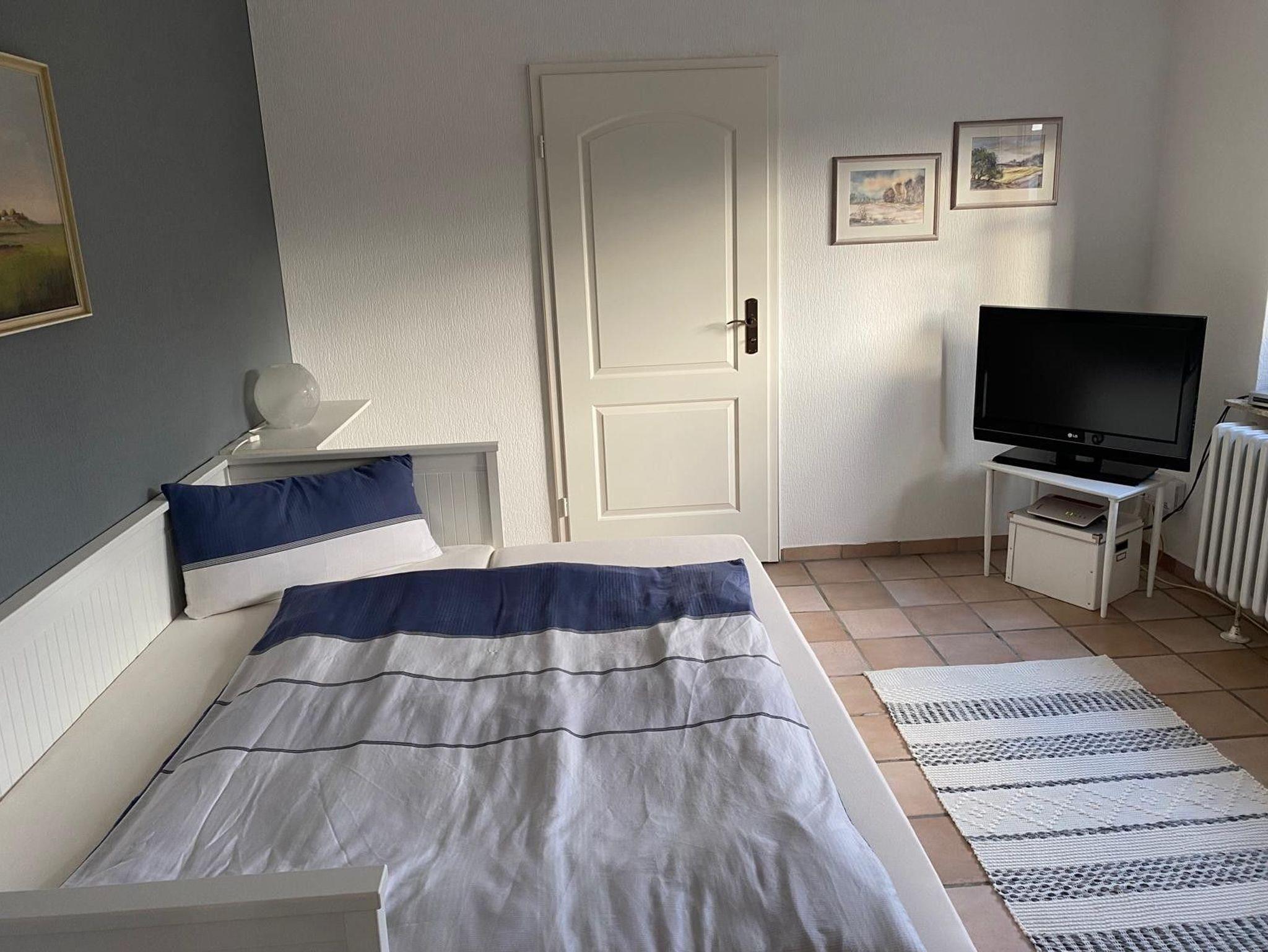 SZ 3: das dritte Schlafzimmer ist mit einem ausziehbaren Bett (Matratzen je 0,70 x 2,00 m) ausgestattet. Auch hier wurde an Kleiderschrank und TV gedacht. Dieses Zimmer ist somit zum einen über das zweite Schlafzimmer, zum anderen über den Flur vom Hintereingang begehbar.