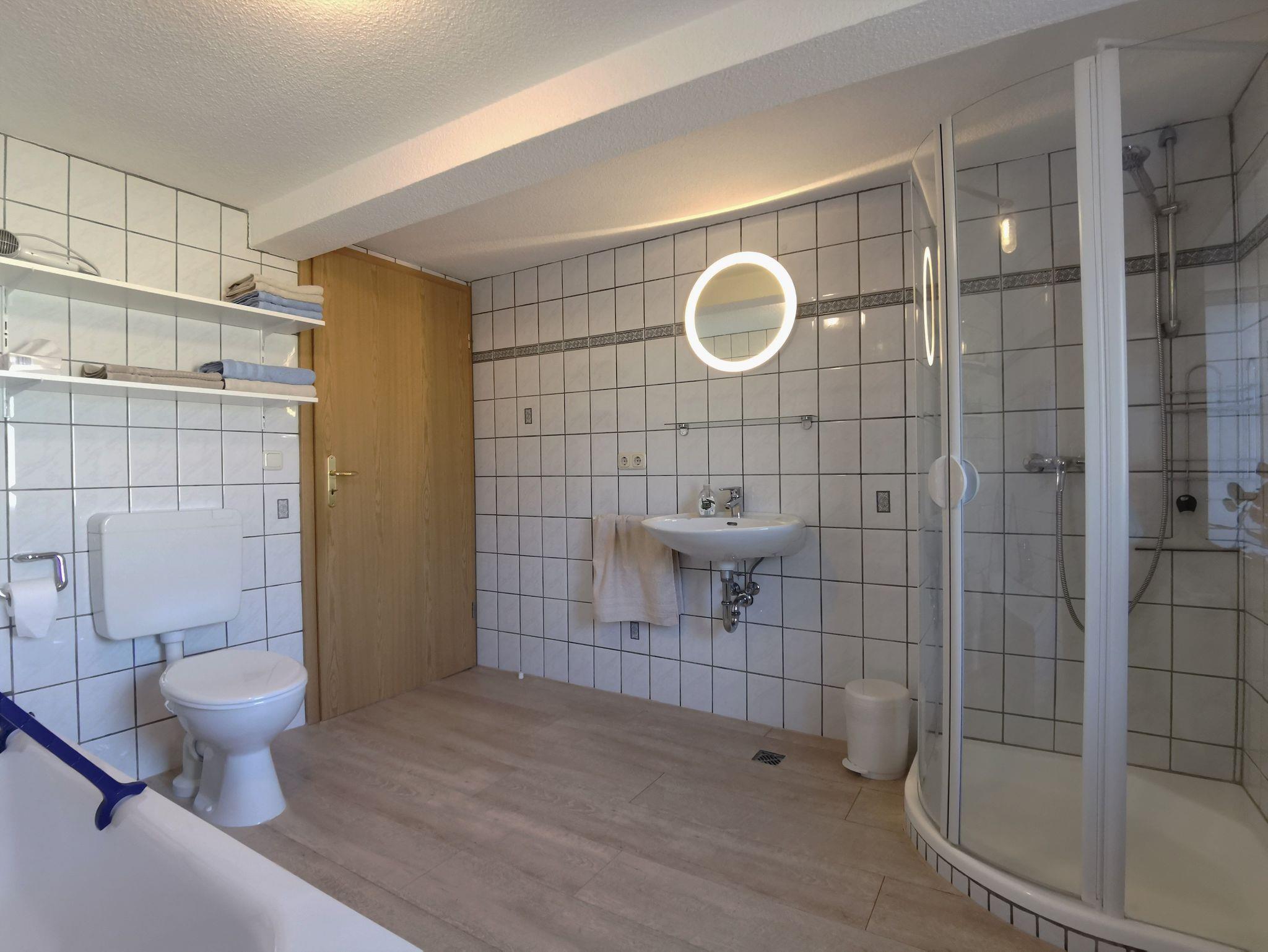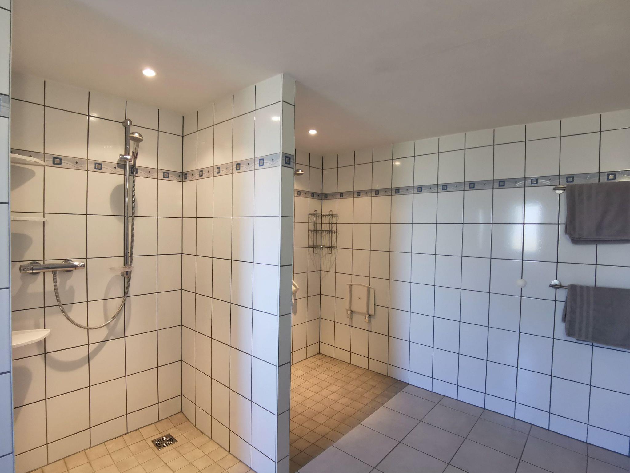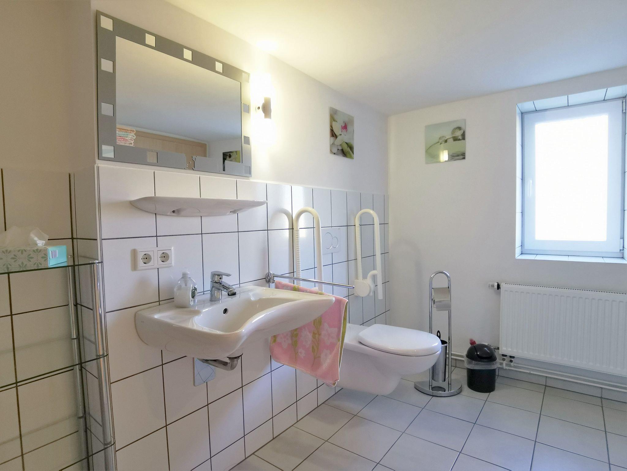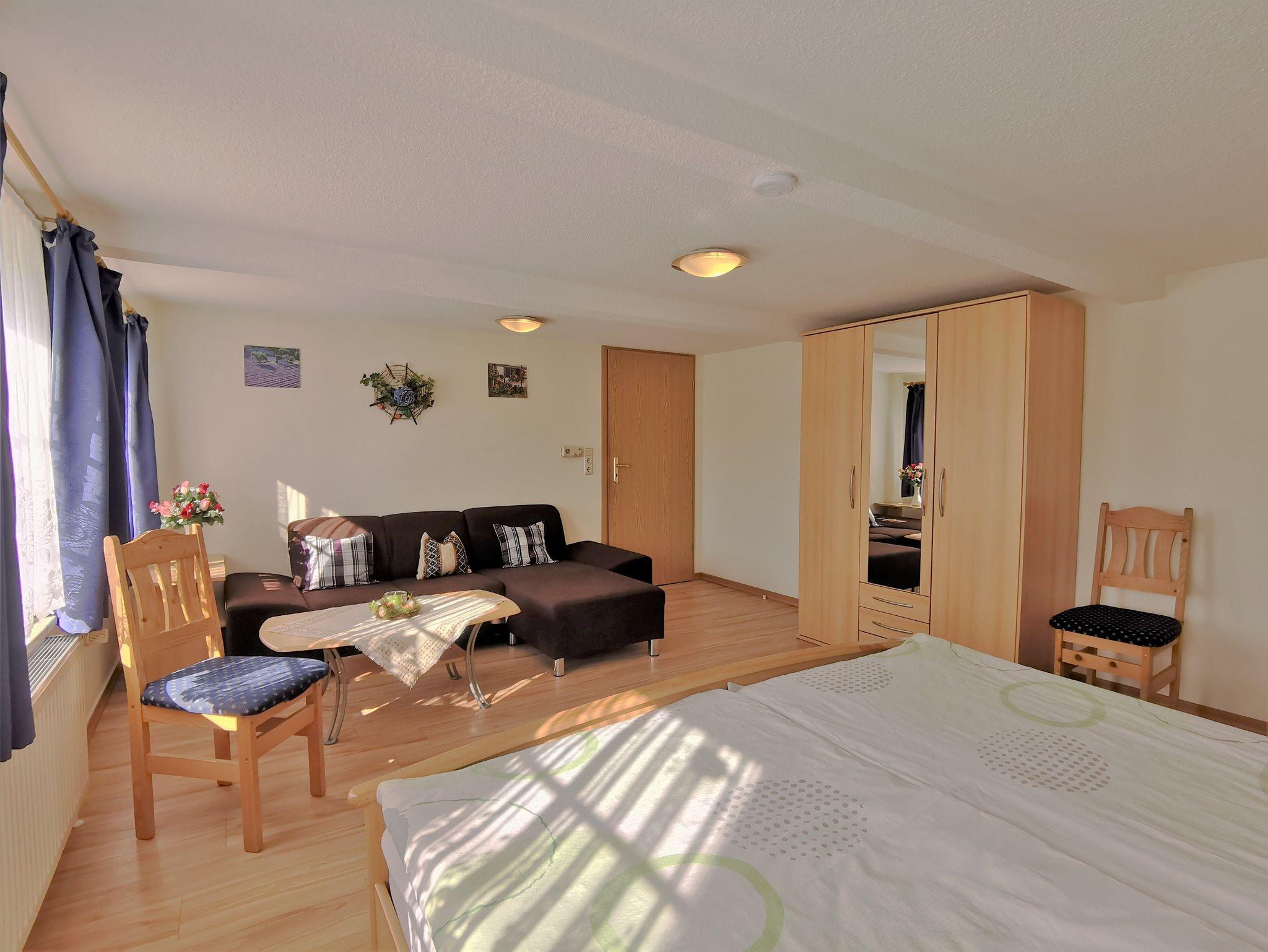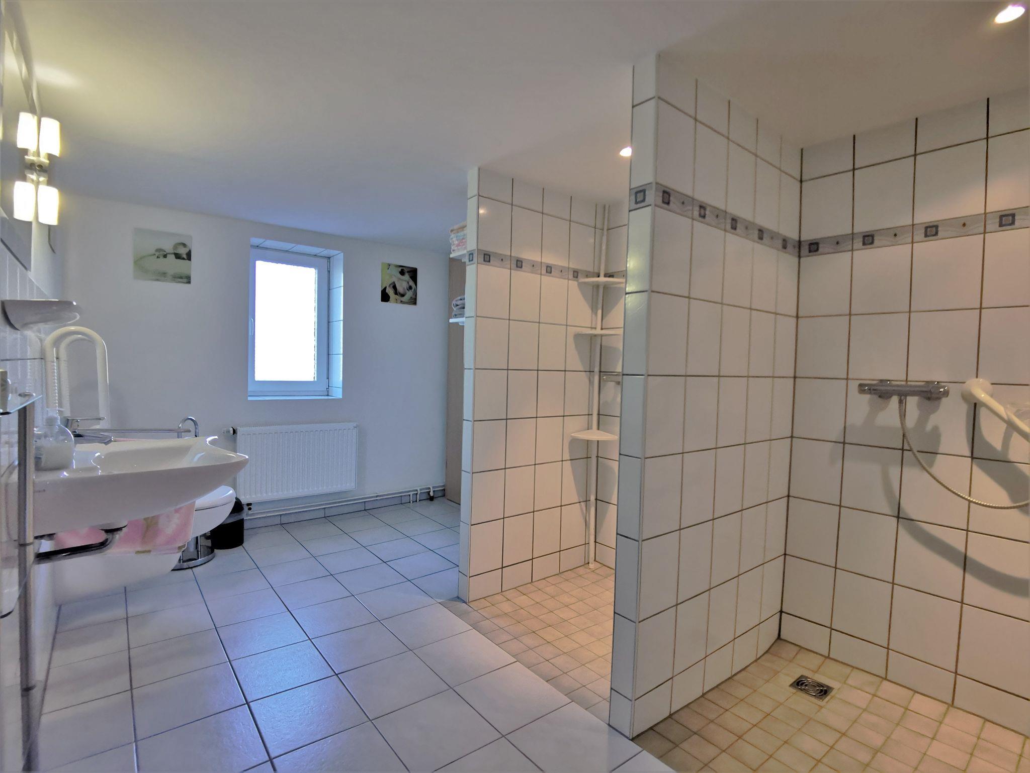 Die große Ferienwohnung verfügt über vier Schlafzimmer mit sieben Schlafplätzen und zwei großen Badezimmern sowie einer zusätzlichen Toilette und ist besonder für große Familien, mehrere Urlaubsparteien oder kleine Reisegruppen geeignet. Es gibt ein großes Schlafzimmer mit Doppelbett und Sofaecke, ein kleineres Schlafzimmer mit Doppelbett, ein Zimmer zwei Einzelbetten und ein Schlafzimmer mit einem französischen Bett für eine Person. Es können bis zu zwei Kinderbetten zugestellt werden. Weiter gibt es drei Badezimmer/Toilette: ein Badezimmer ist mit Dusche und Badewanne ausgestattet, ein weiteres Bad hat eine behindertengerechte Einrichtung (WC und zwei ebenerdige Duschen) und zusätzlich gibt es noch eine gesondertes WC. Der große, modern eingerichtete Aufenthaltsraum ist mit vielzähligen Tischen und Stühlen, einem großen Flachbild-TV und einem Kamin sowie einer großen Küchenzeile ausgestattet - hier können Sie gemeinsam ihre Mahlzeiten einnehmen, Spiele spielen und gemütlich zusammensitzen. Auf Nachfrage werden geführte Radtouren ins schöne Umland angeboten.