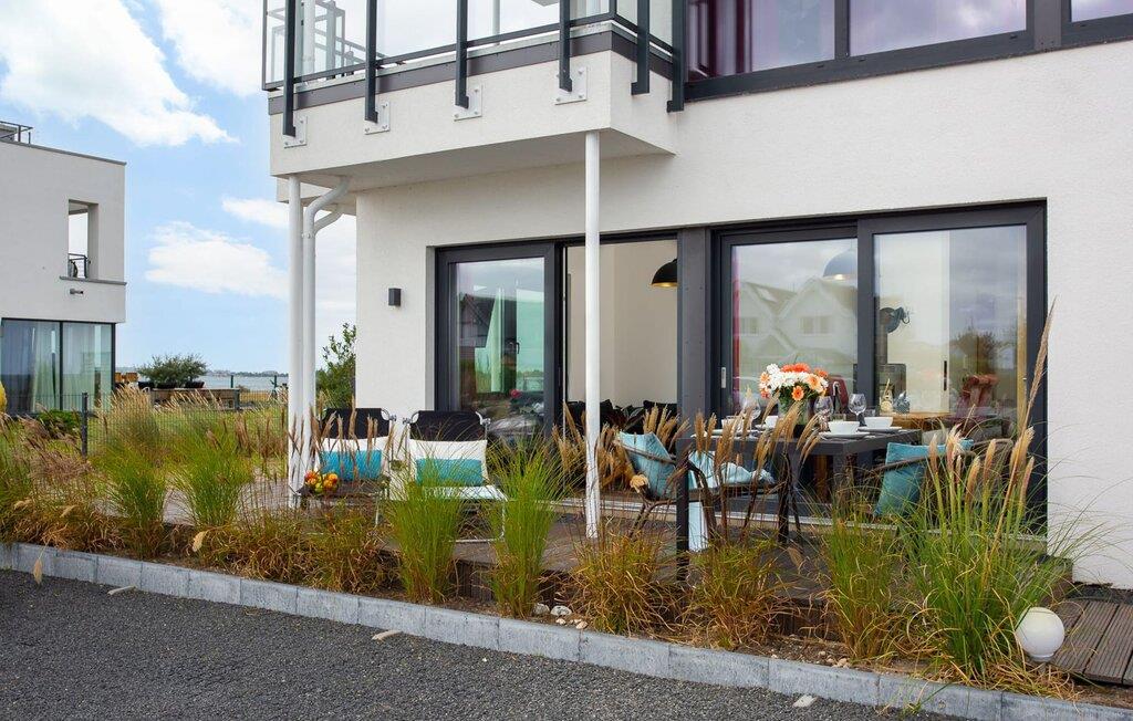 En terrasse, der strækker sig vinkelret rundt om lejligheden, giver mulighed for at spise, slappe af eller tilbringe hyggelige timer med at læse udenfor, også med udsigt til naturreservatet.