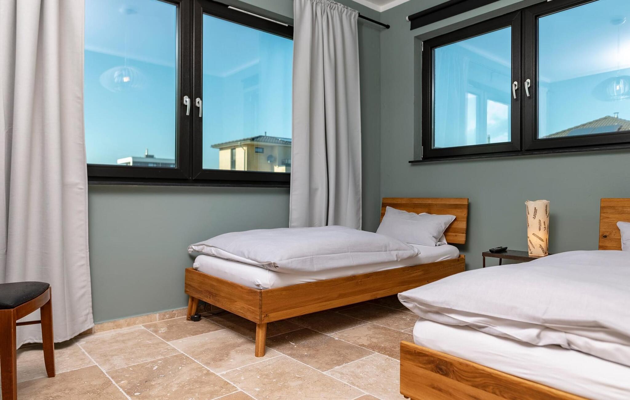 Den unikke arkitektur med imponerende højt til loftet og gulv-til-loft vinduer skaber en uforglemmelig ferieoplevelse, fordi vandet er tæt nok til at røre ved. Den økologiske bygning med kalkpuds sørger for et behageligt indeklima, mens naturstensgulve af let italiensk travertin er jordforbindelse i egentlig forstand. Denne feriebolig er udstyret til en høj standard og har et unikt design med souvenirs fra hele verden. Hvert værelse har også en anden naturlig vægfarve. De helt spejlede vinduer skaber maksimal privatliv.