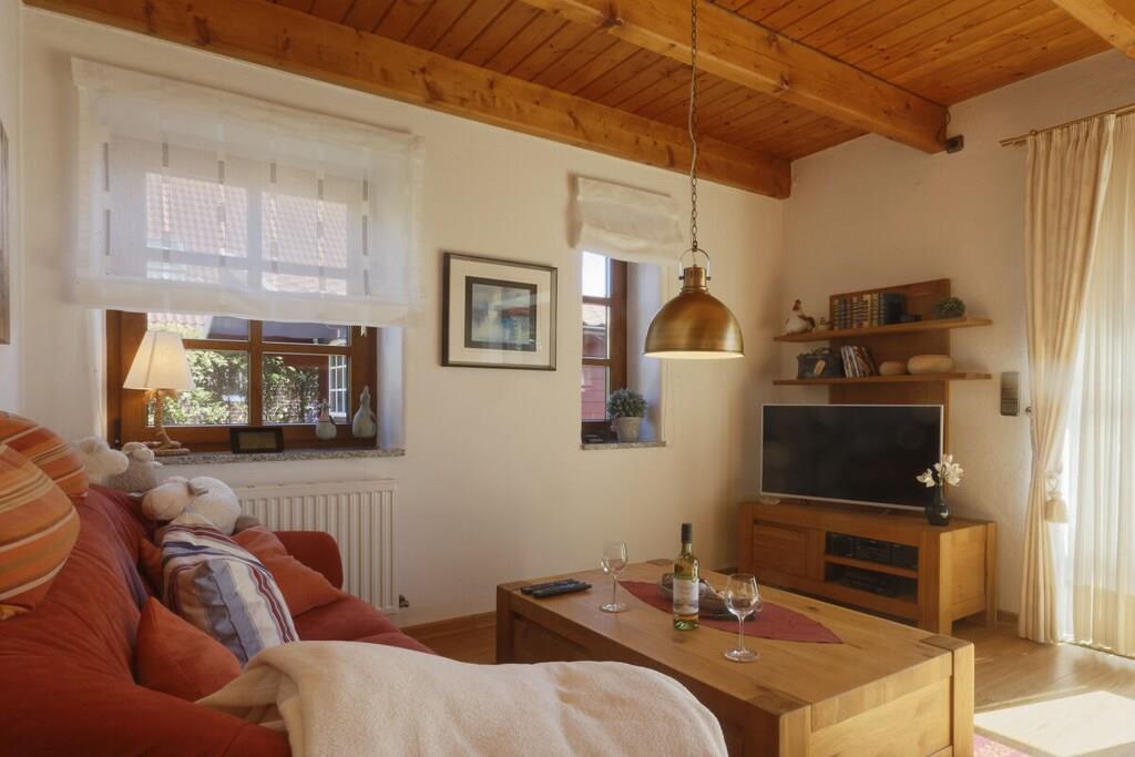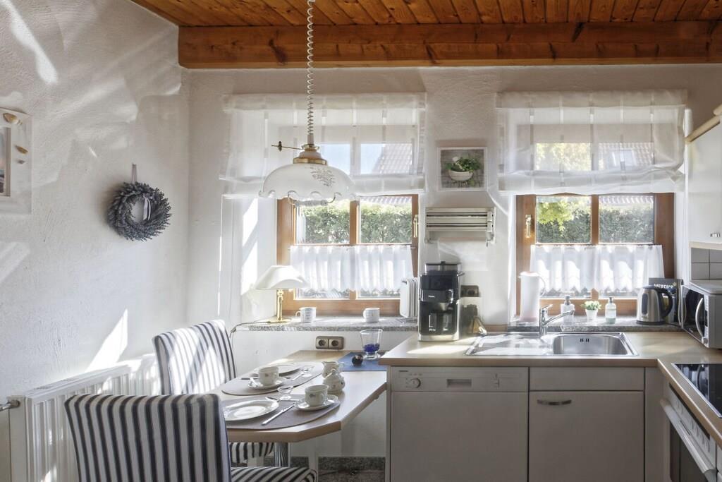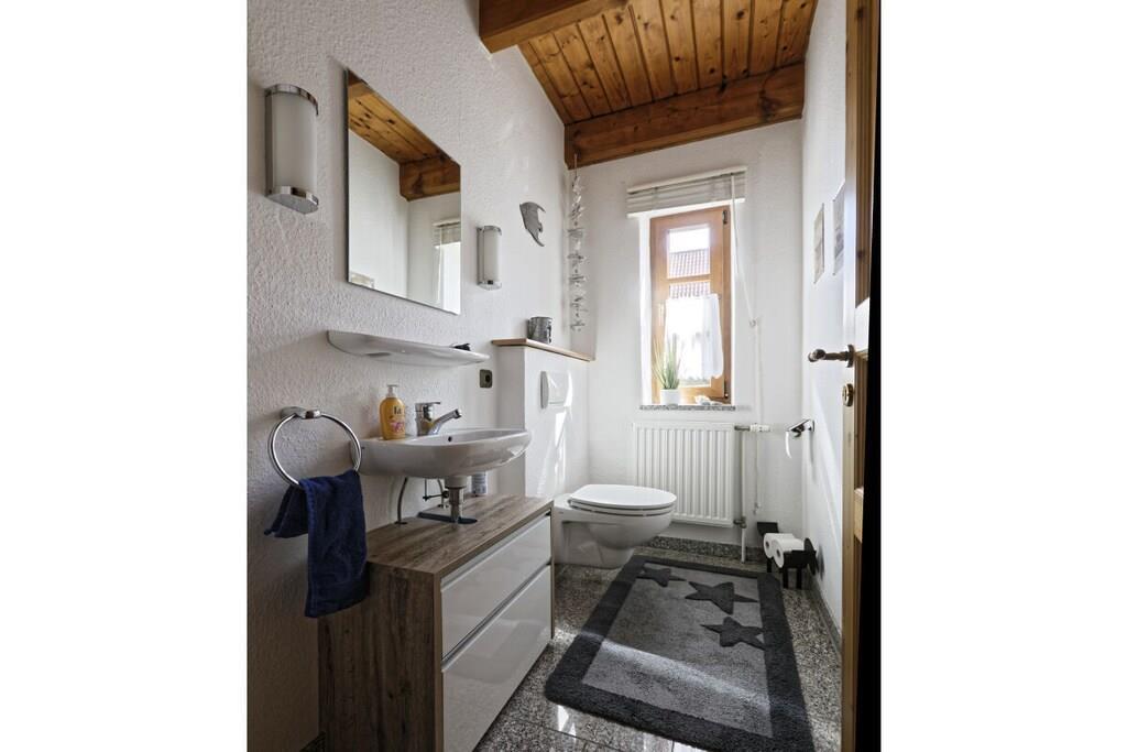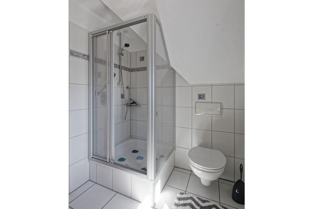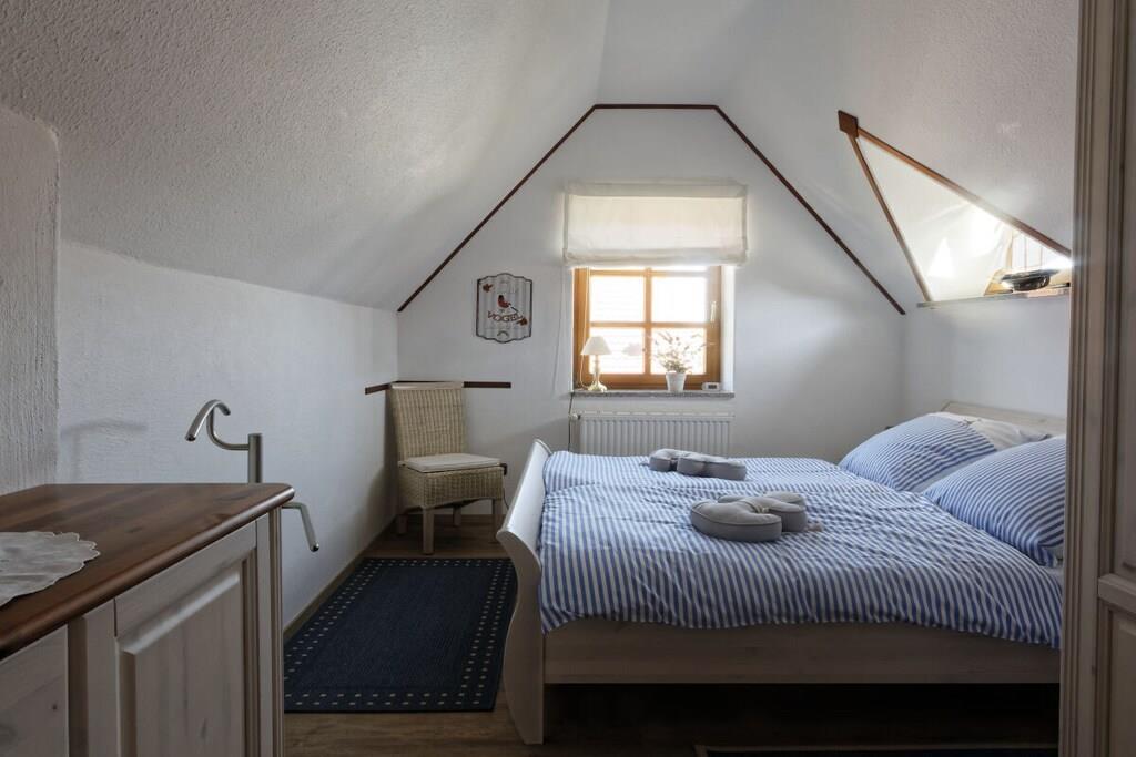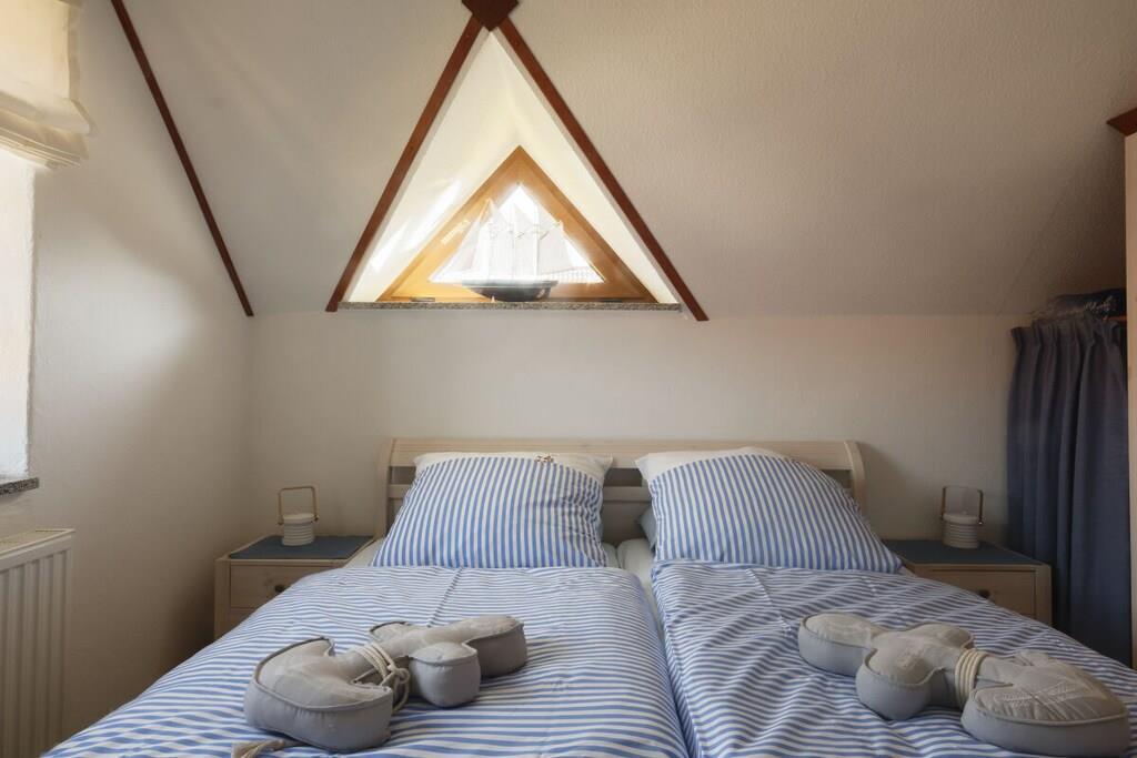Ein komfortables Ferienhaus für 2 Personen auf 2 Ebenen mit einer großen Terrasse mit Gartenmöbeln, Strandkorb und Grillmöglichkeit. Zum Haus gehört außerdem ein Carport. Im Erdgeschoss finden Sie ein gemütliches Wohnzimmer mit Essecke, TV, Hifi und Telefon. Gleich nebenan befindet sich die Küche – mit allen Potten und Pannen. Sie können sich hier komplett selbst verpflegen. Außerdem im Erdgeschoß: ein Gäste-WC und ein Abstellraum mit Waschmaschine und Trockner. Im Obergeschoss finden Sie das gemütliche Doppelzimmer mit Dachgauben und Zeit für schöne Träume. Das Bad befindet sich gleich nebenan.