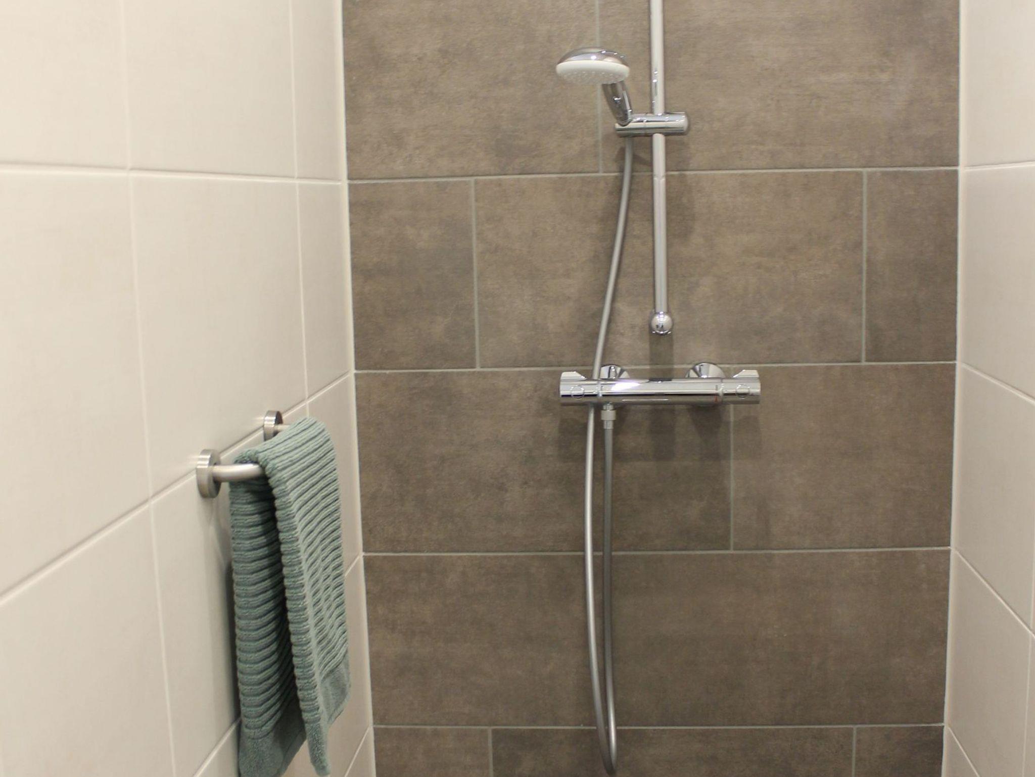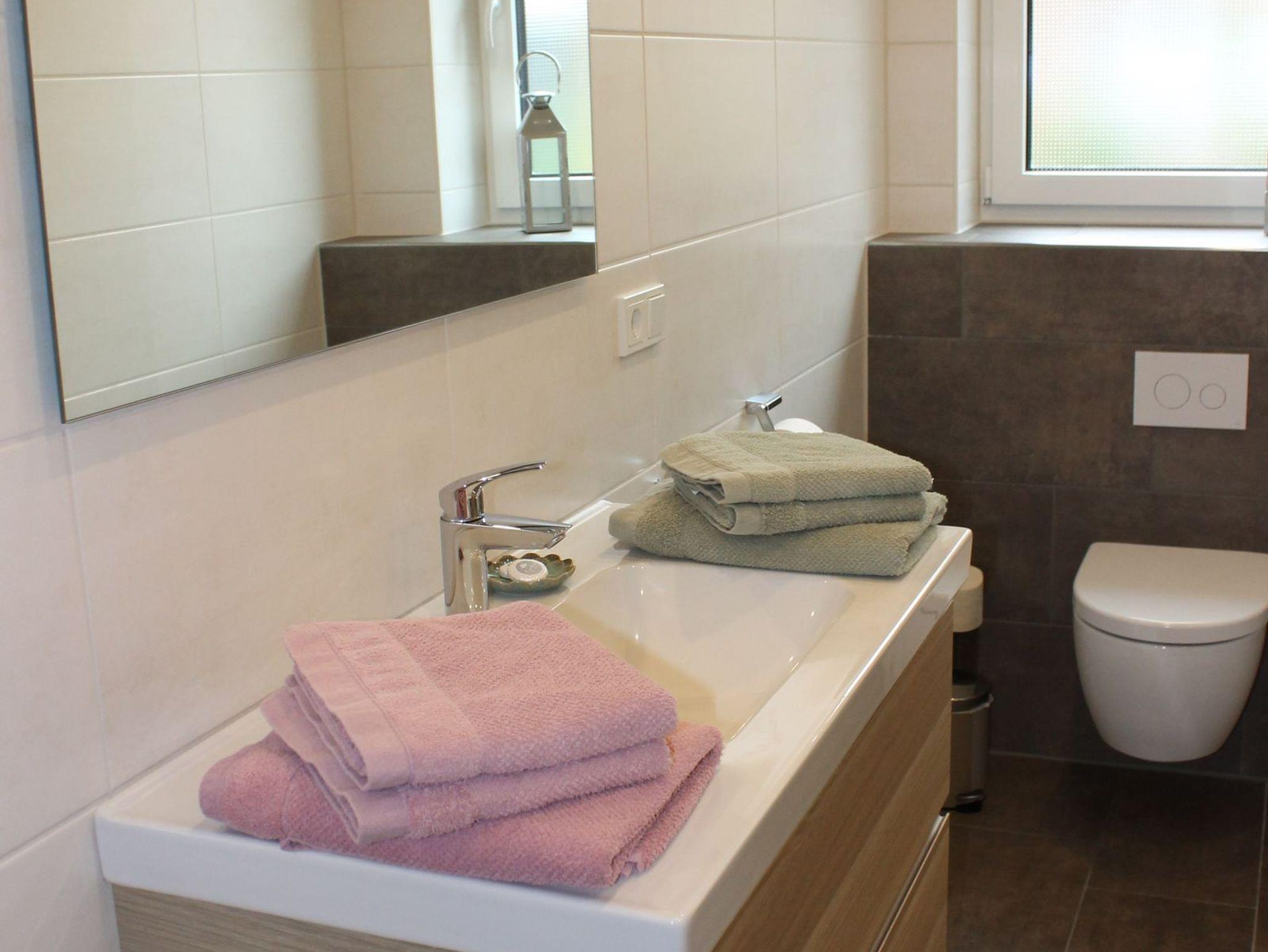 Im Erdgeschoss befindet sich ein geräumiges Tageslicht-Duschbad mit Handtuchtrockner und Fön.