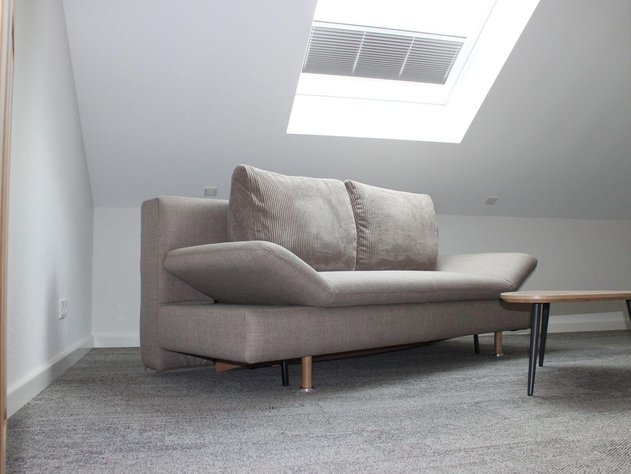 Der Küchen- und Wohnbereich ist stilvoll eingerichtet und mit gemütlicher Sitzecke und Fernseher ausgestattet. Die komfortable Küchenzeile verfügt über Spülmaschine, Induktionskochfeld, Backofen, Kühlschrank mit Gefrierfach, Kaffeepad-Maschine, Toaster etc.