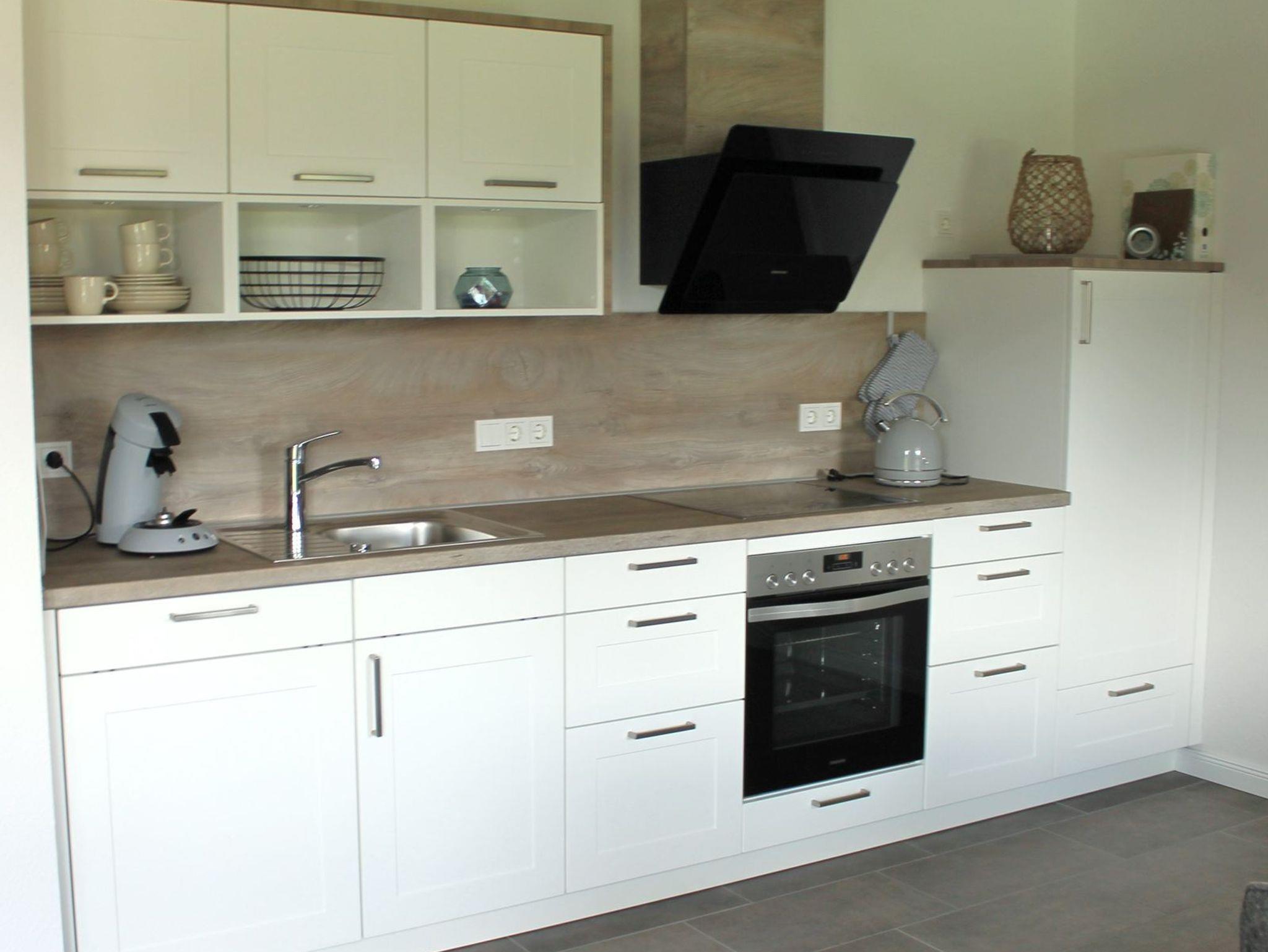 Der offene Küchen- und Wohnbereich mit Galerie ist stilvoll eingerichtet und mit gemütlicher Sitzecke und Fernseher ausgestattet. Die komfortable Küchenzeile verfügt über Spülmaschine, Induktionskochfeld, Backofen, Kühlschrank mit Gefrierfach, Kaffeepad-Maschine, Toaster etc.