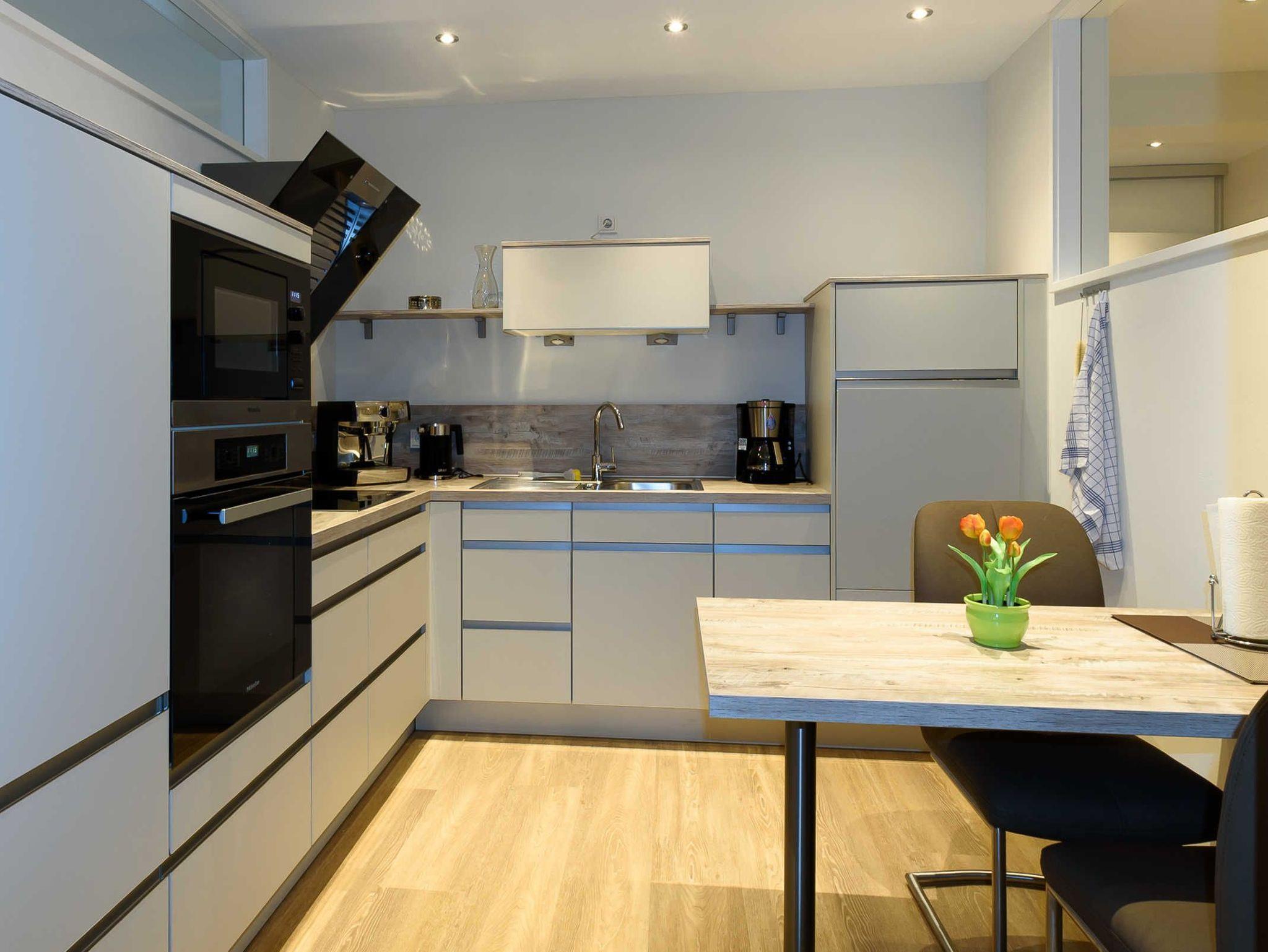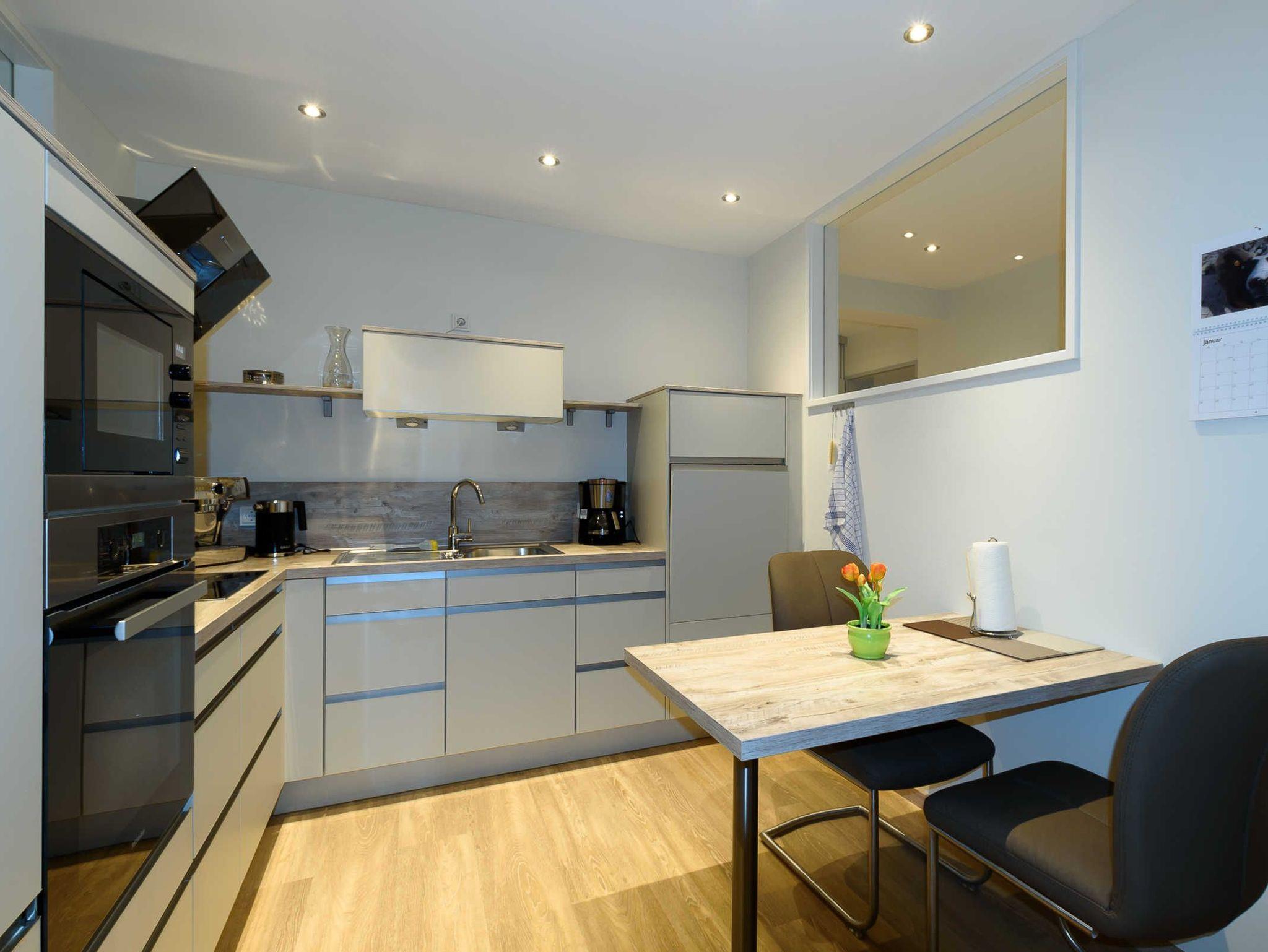 Moderne Küche mit Miele-Einbaugeräten sowohl Siebträger- als auch herkömmliche Kaffeemaschine Eier- und Wasserkocher, Mixer komplettes Koch- und Backgeschirr kleiner Tisch mit Sitzmöglichkeit für 2-3 Personen