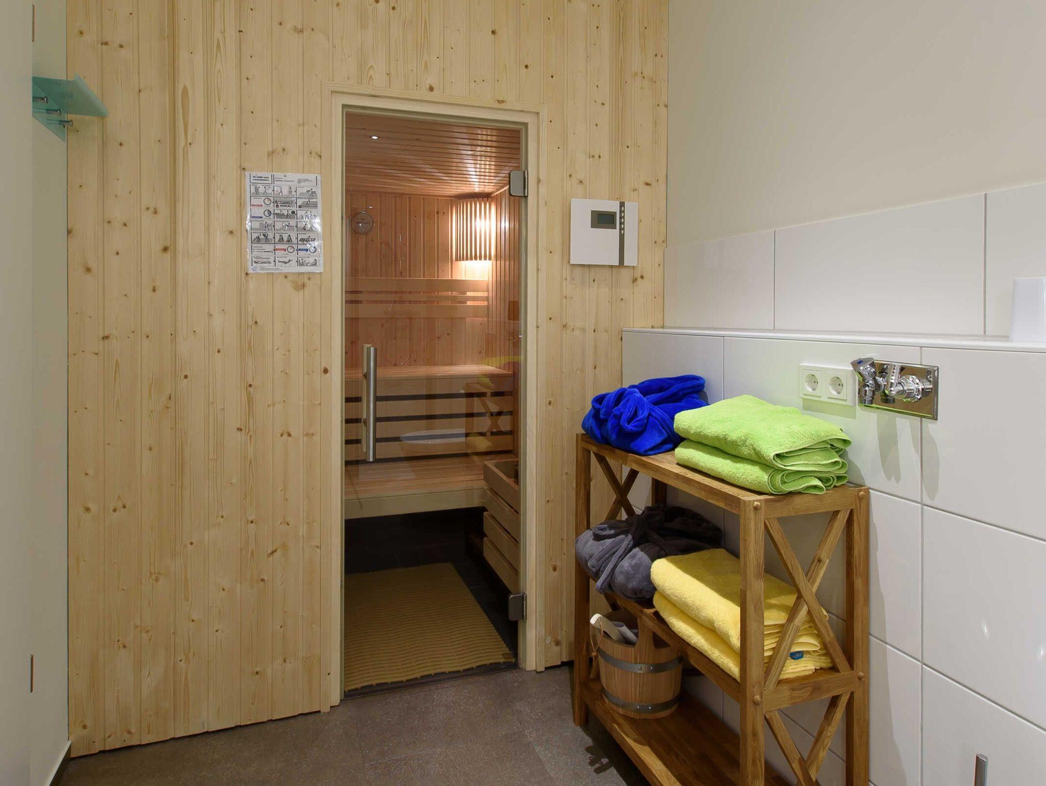 Im Bad befindet sich eine private Sauna.