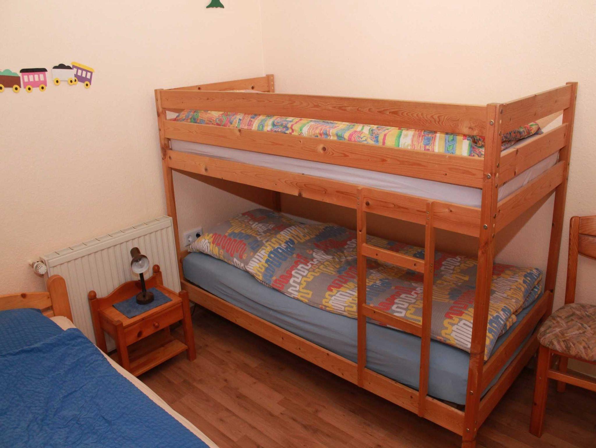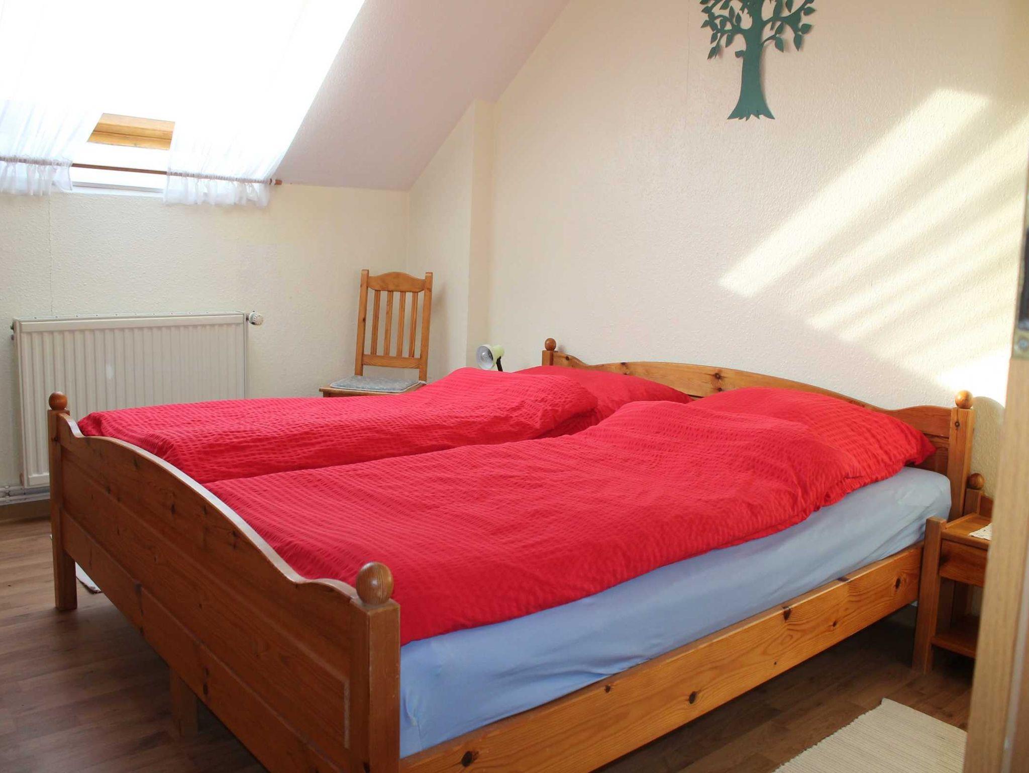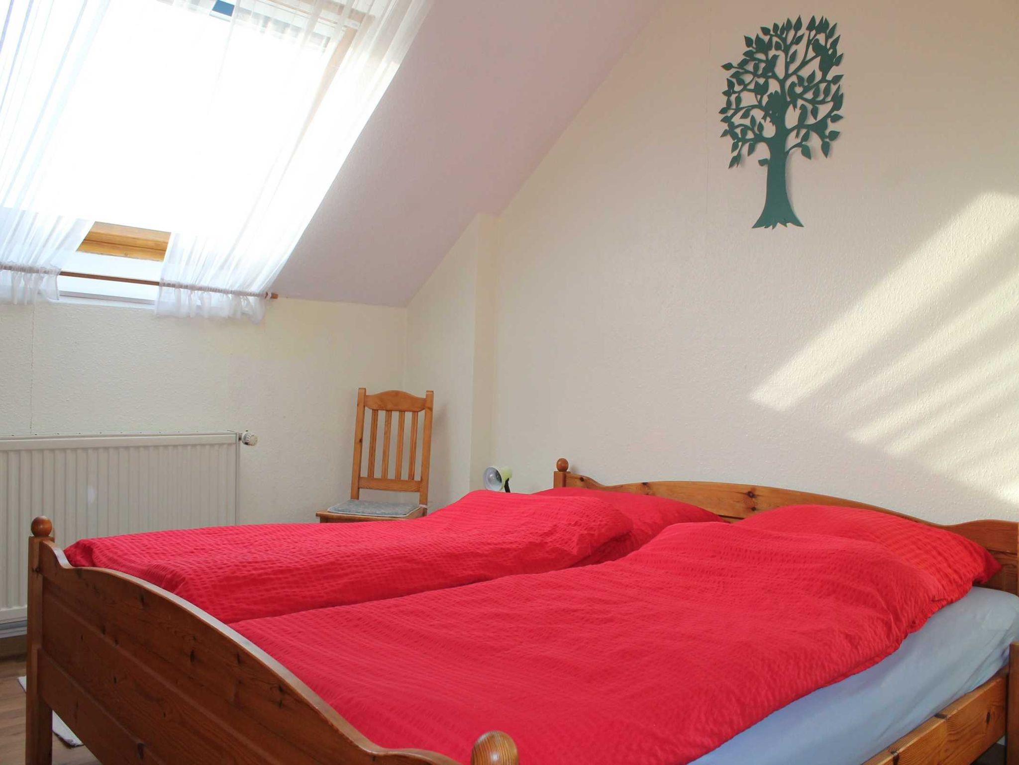 Die Ferienwohnung 1 hat eine Wohnfläche von ca. 65 m² mit zwei separaten Schlafzimmern, einem Doppelzimmer und einem weiterem Zimmer mit 3 Betten (ein Hochbett und ein normales Bett). Badezimmer mit Dusche und WC. Komplett eingerichtete Küchenzeile mit Kaffeemaschine, Wasserkocher, Mikrowelle, Mixer, Toaster, Eierkocher, Herd & Backofen, Kühlschrank und sonstigem Hausrat. Das Wohnzimmer ist mit einem Farbfernseher (Sat-Anlage) und Radiogerät ausgestattet. Für die kleinen Gäste steht ein Reisebettchen oder Kinderbett einschließlich Bettwäsche sowie ein Hochstuhl, Spielzeug und ein Spielplatz zur Verfügung. Hunde sind bei uns auch gern gesehene Gäste.