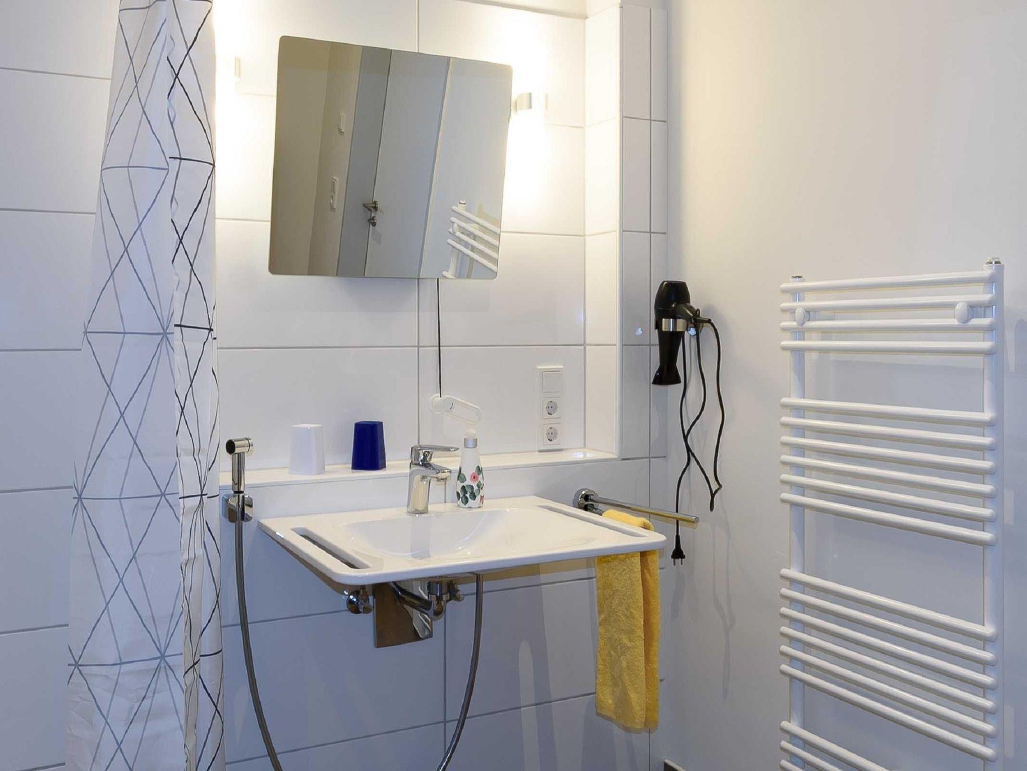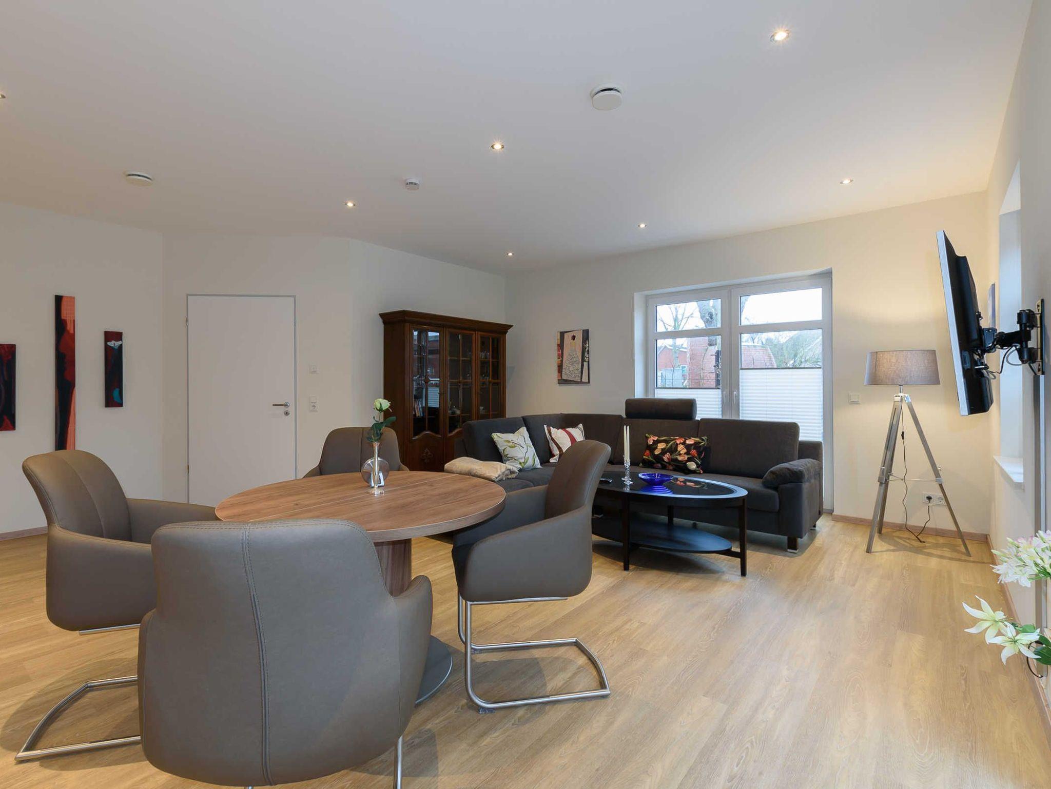 Auch hier gilt: Freie Fahrt für Rollstuhl und Rollator! Genau wie in Wohnung 1 genießen Sie viel Bewegungsfreiheit und erstklassige sanitäre Annehmlichkeiten. Auch immer mehr Gäste ohne Behinderungen wissen diesen außergewöhnlichen Komfort zu schätzen.Sie befindet sich im Erdgeschoss und verfügt über 2 Terrassen, die einmal westseitig, einmal nordseitig ausgerichtet sind. Wohnzimmer und Küche sind durch eine offene Bauweise verbunden. Fußbodenheizung in der ganzen Wohnung kostenfreies WLAN
