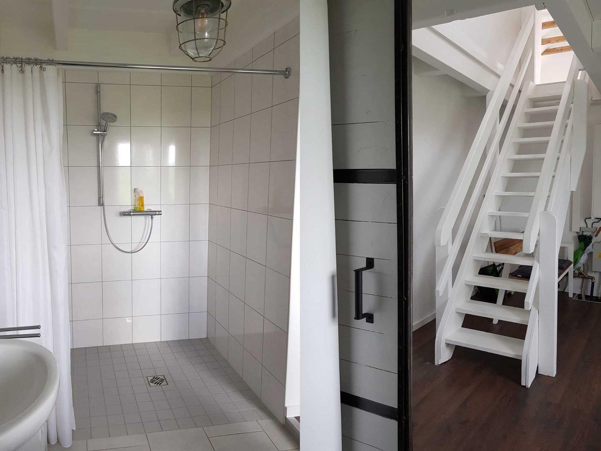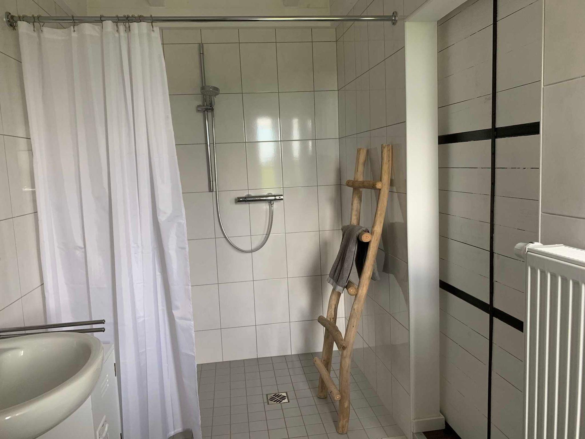 Wassersprudler. Das Bad hat eine große bodengleiche Dusche. Waschmaschine und