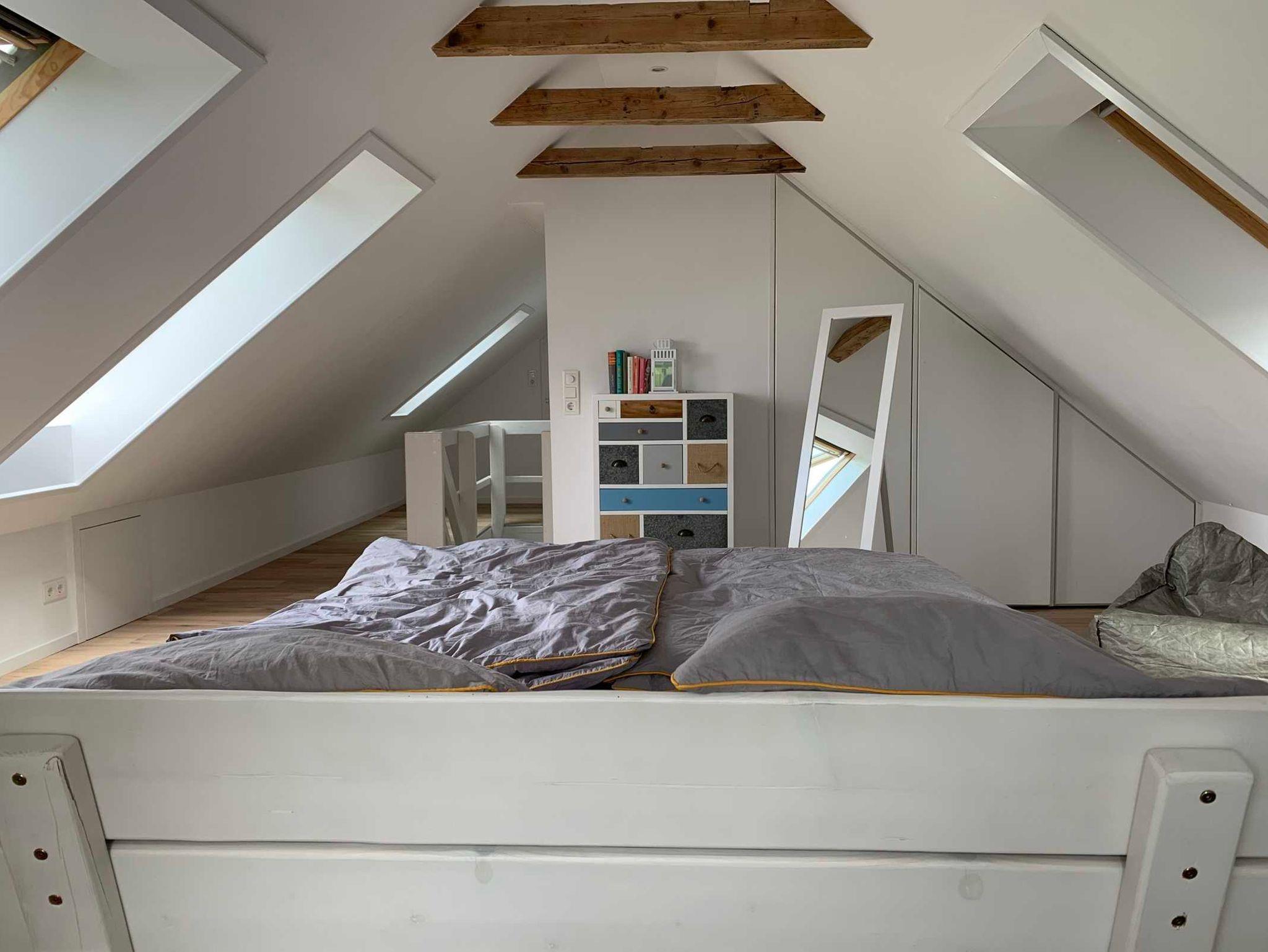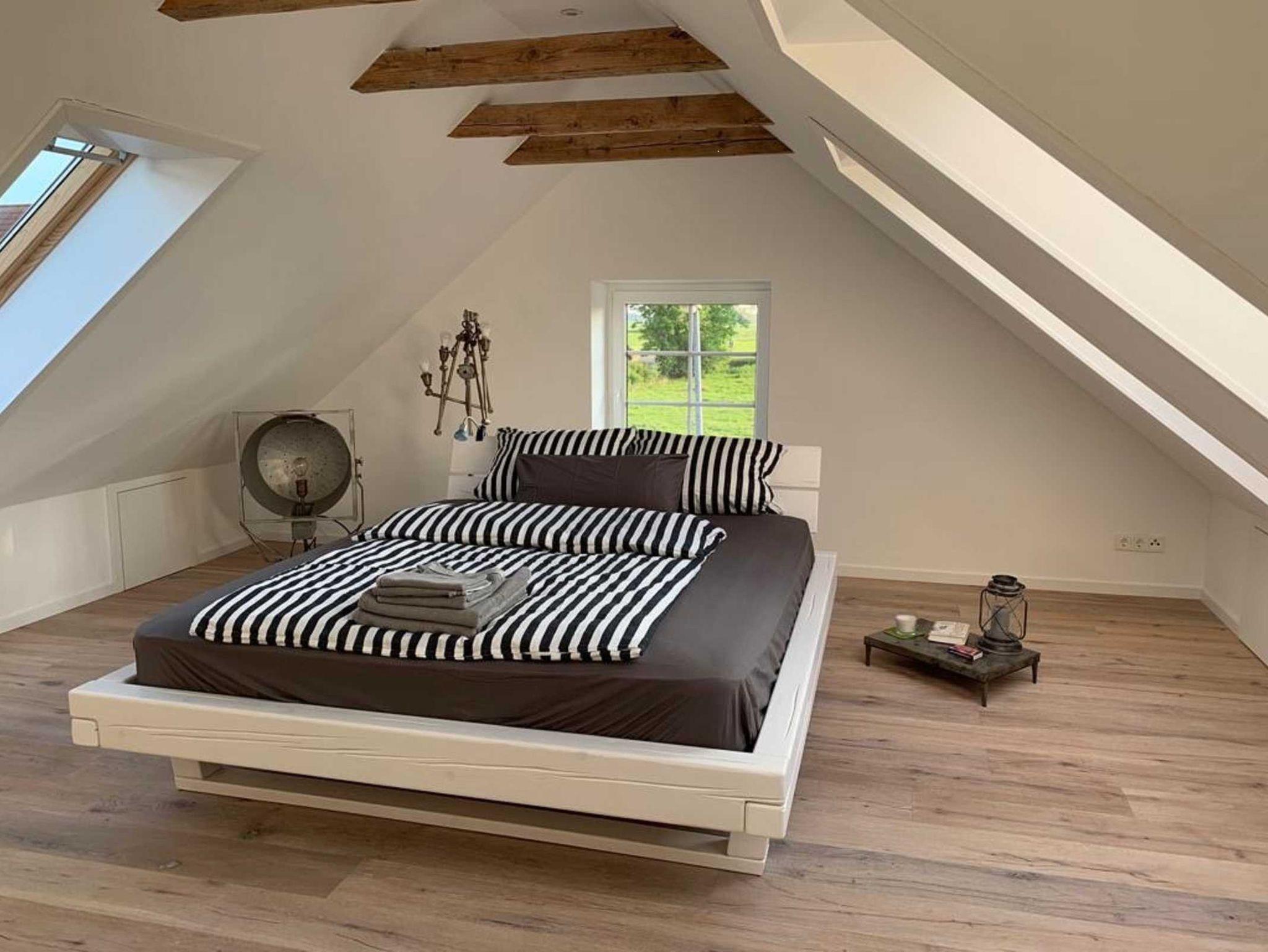 Schlafzimmer mit einem großen Doppelbett im Obergeschoss. Der geräumige