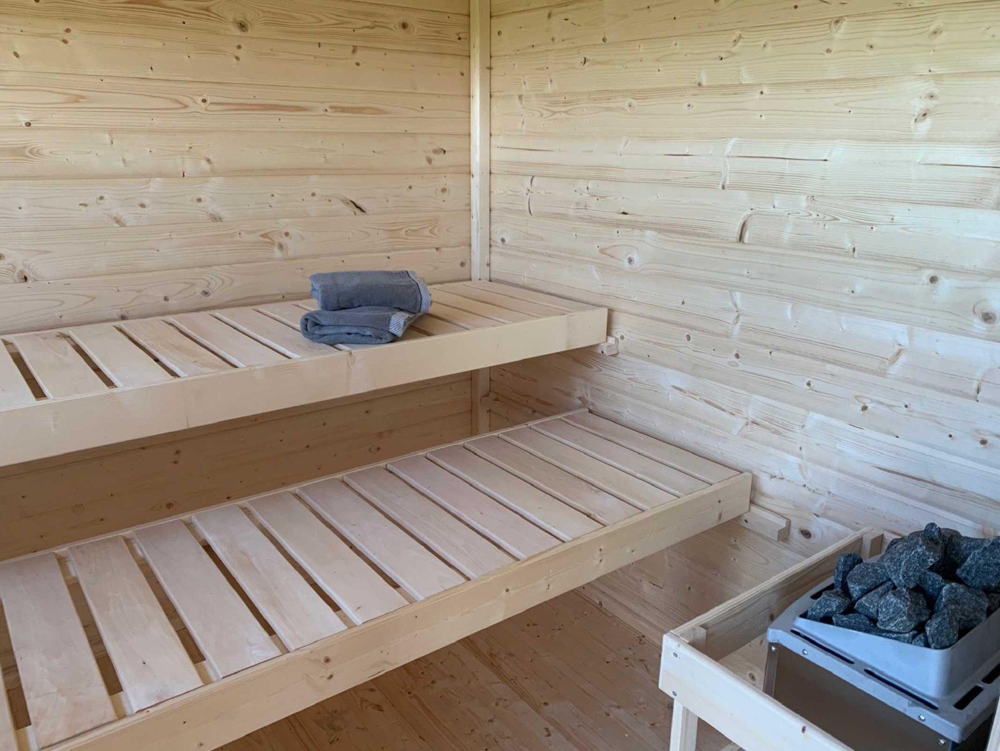 Anschließend lädt die Außensauna zum Entspannen ein, die Sie für 25,- Euro pro Tag buchen können.