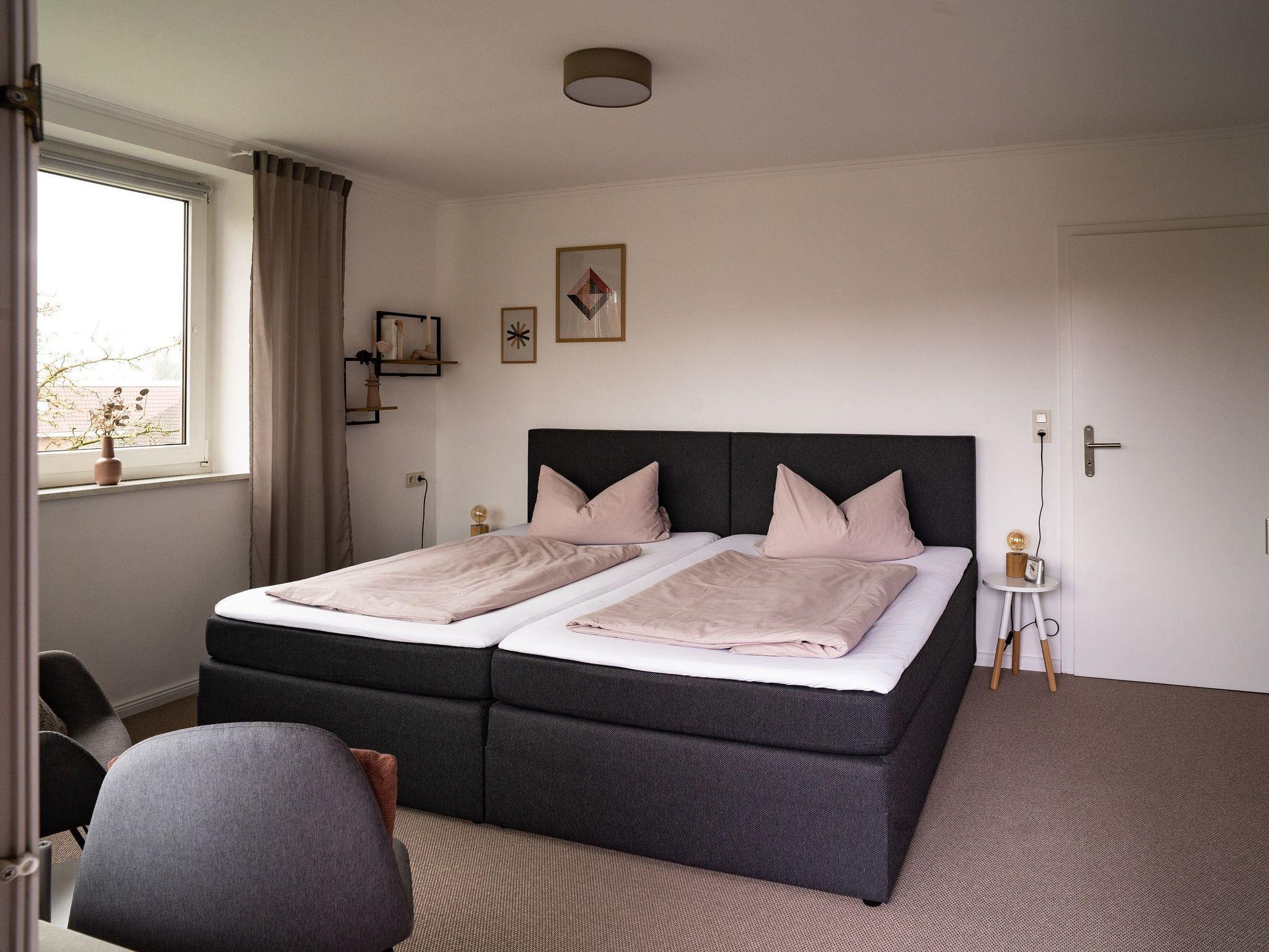 Seperater Eingang. Im Obergeschoss liegen die Schlafzimmer, einmal ausgestattet mit getrennten Boxspringbetten (1,20x2,00m) und ein Schlafzimmer mit Doppelbett (1,60x2,00).
