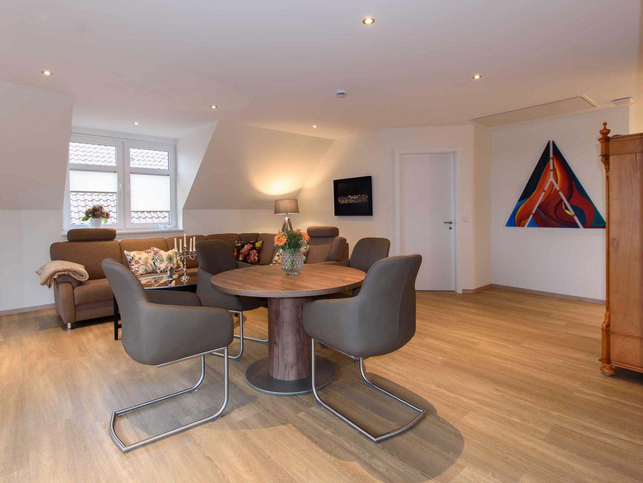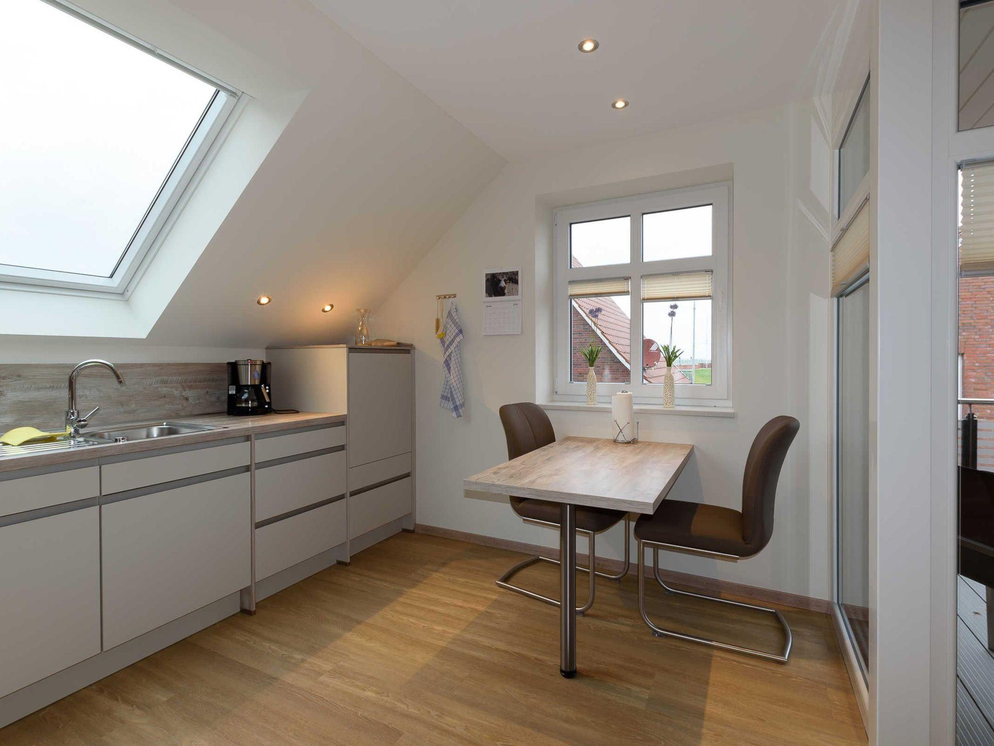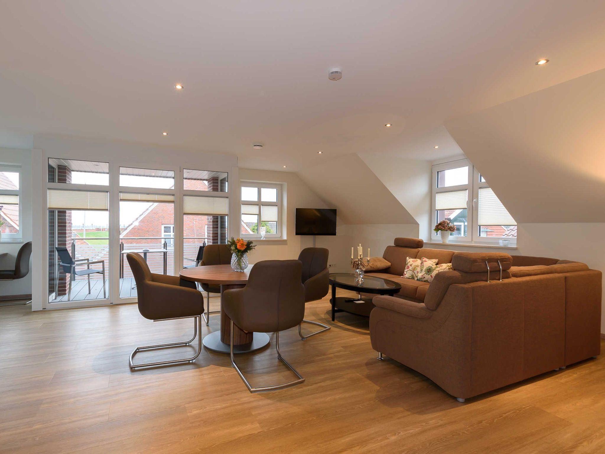 Sie befindet sich im Obergeschoss und verfügt über eine Loggia mit Blick auf den Deich und die Ems.