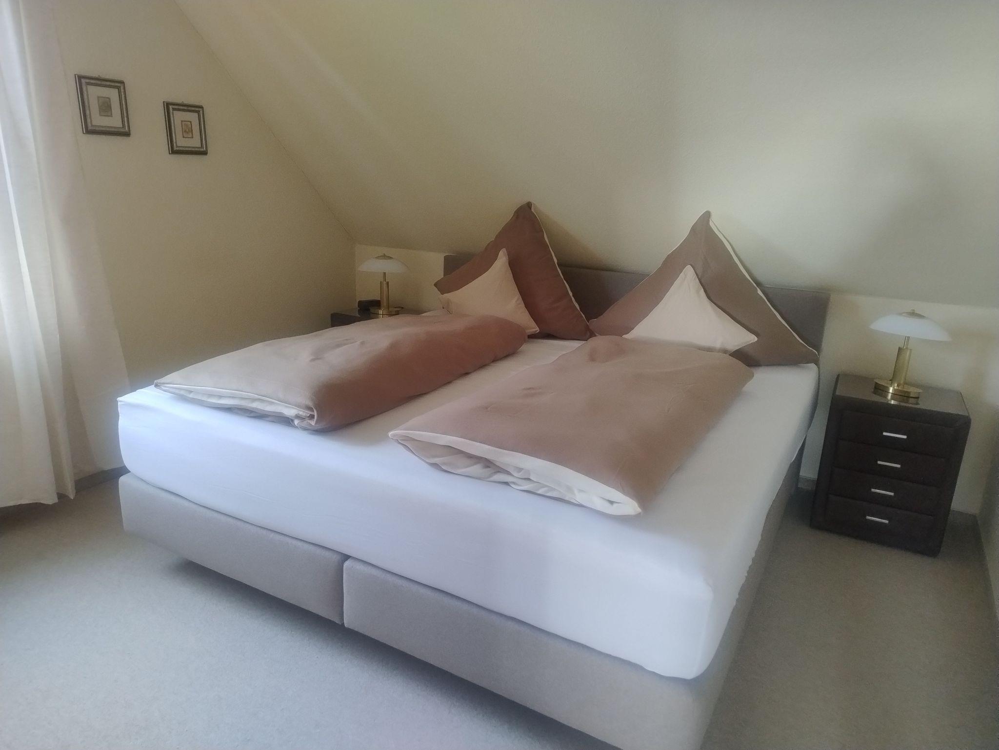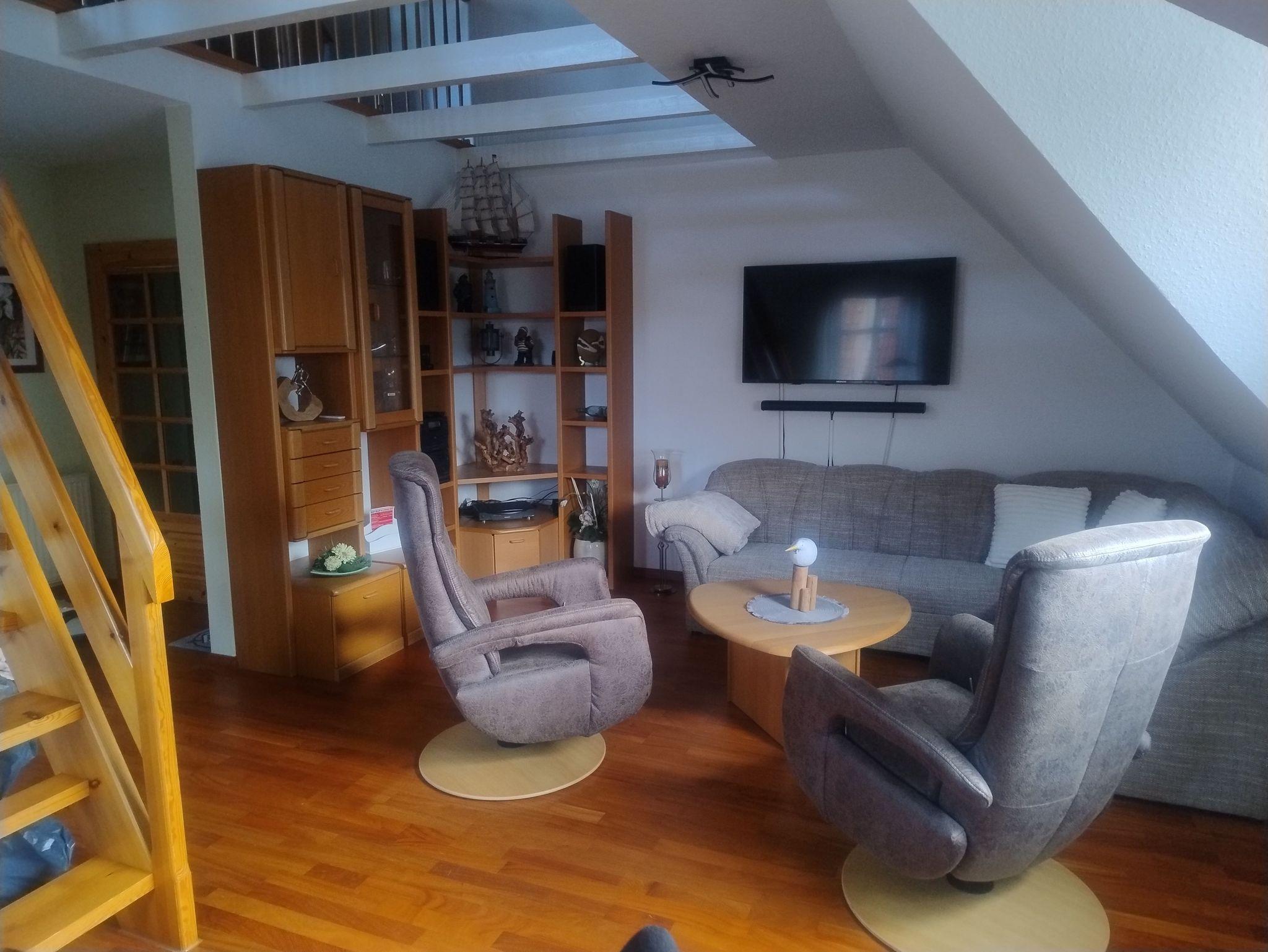 Unsere FeWo bietet eine voll ausgestattete Küche. Entspannen Sie auf dem Balkon oder im gemütlichen Wohnzimmer mit Relaxsesseln, TV und freiem W-Lan. Die Wohnung hat ein Tageslichtbad mit Dusche/WC, im Schlafzimmer befindet sich ein Boxspringbett (2x2m). Oben in der offenen Galerie lädt eine gemütliche Leseecke am Fenster zum Verweilen ein. Sollten Sie beruflich unterwegs sein, ist oben ein Schreibtisch vorhanden.