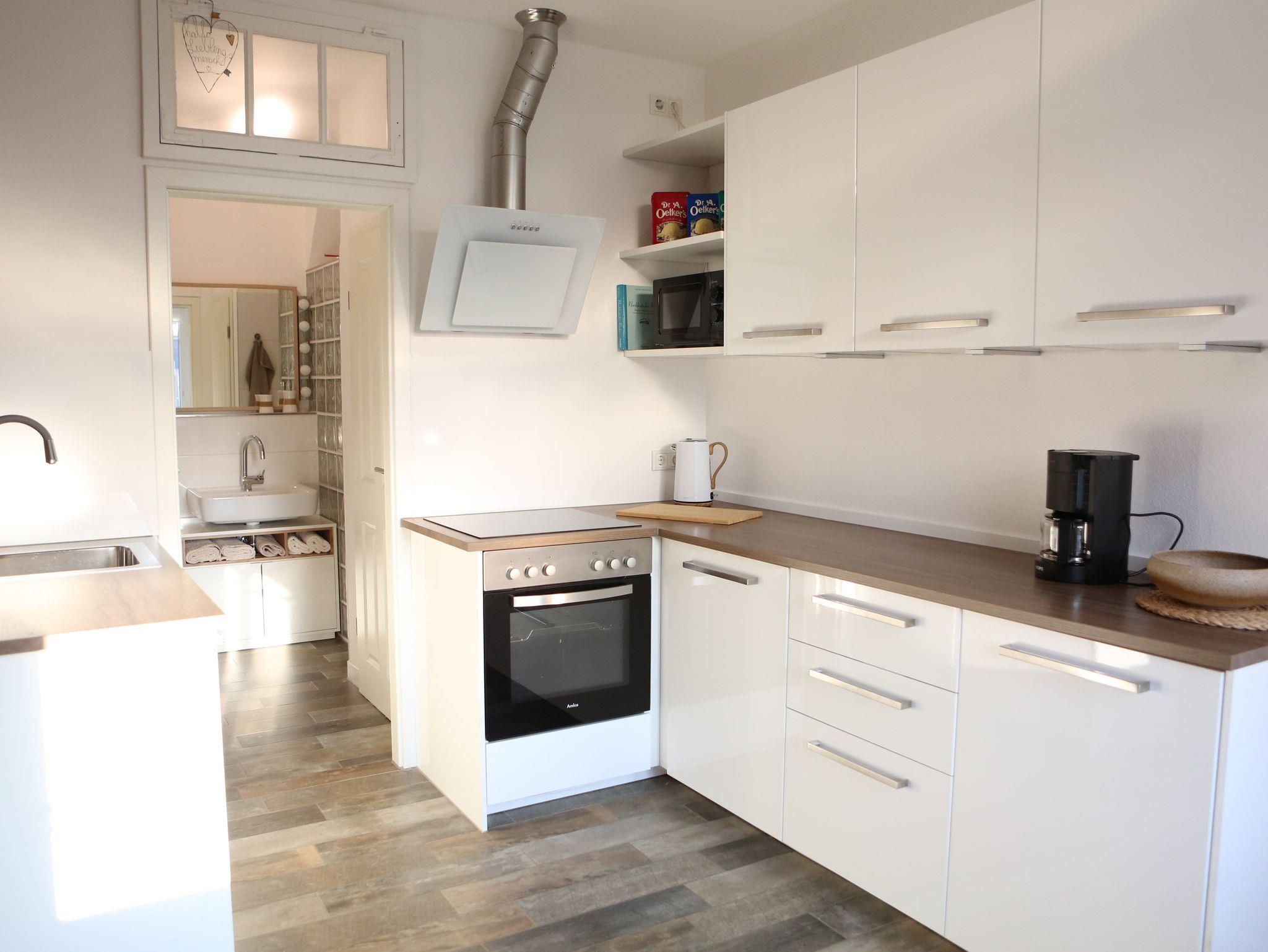 Die Ferienwohnung verfügt über einen Wohn-Essraum, ein Schlafzimmer, eine voll ausgestattete Küche und ein Badezimmer mit Dusche.