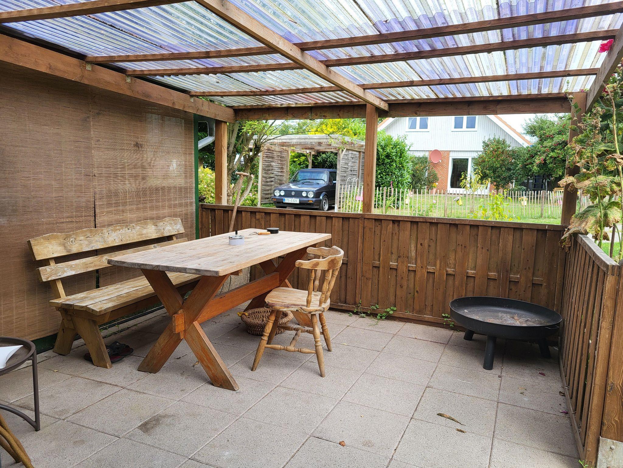 Die überdachte Terrasse befindet sich vor der Haustür und ist mit einem großen Holztisch, einer Bank und Stühlen ausgestattet. Sie liegt sehr geschützt, so dass selbst die steife Brise bei uns im Norden dir nichts anhaben wird.