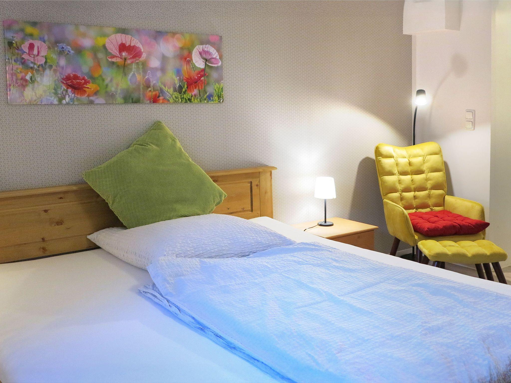 3 Schlafzimmer erwarten dich - zwei mit jeweils einem Einzelbett und eines mit einem Doppelbett. In jedem Schlafzimmer befindet sich ein Kleiderschrank und ein Fernseher mit Satelitenempfang. In den beiden großen Schlafzimmern bietet ein kleiner ausgestatteter Schreibtisch mit Stuhl sowie ein kleiner Sessel zusätzliche Möglichkeiten für Arbeit und Entspannung.