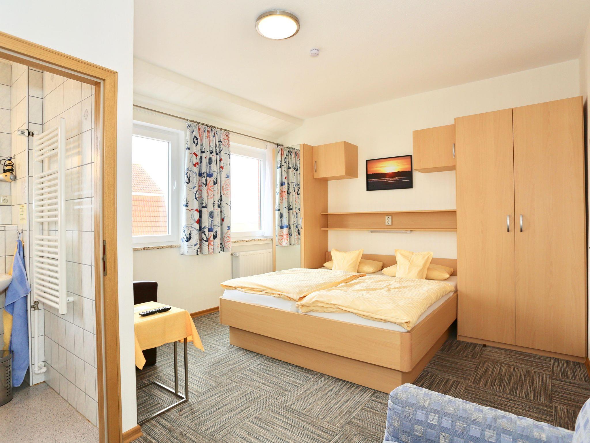 Unser Nichtraucher-Familienzimmer ist als komfortables Dreibettzimmer mit Dusche/WC ausgestattet und bietet Ihnen Annehmlichkeiten wie einen Kabel-TV. Die hochwertigen Seniorenbetten mit verstellbaren Lattenrosten und Kaltschaummatratzen sorgen für besonderen Schlafkomfort. Als Highlight genießen Sie vom Zimmer aus einen reizvollen Hafenblick im 45-Grad-Winkel.