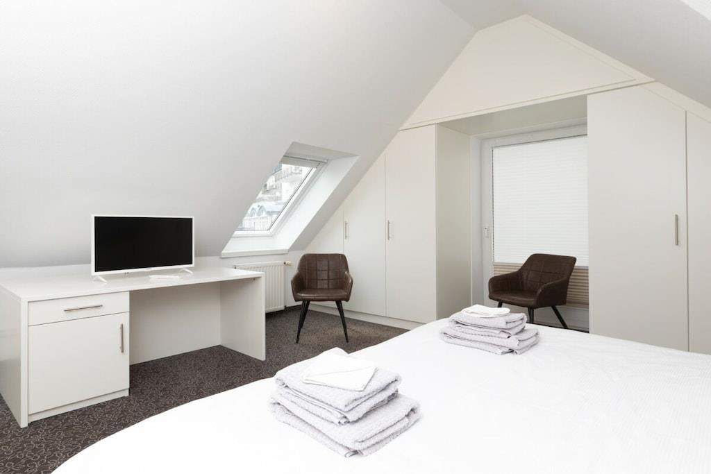 Sie wohnen in unserem rauchfreien Maisonette- Appartement über der Geschäftspassage mit allem Komfort, den Sie sich im Urlaub wünschen. Das Wohnzimmer unten ist Flachbildschirm-TV ausgestattet. Im Schlafzimmer unterm Spitzdach steht ebenfalls ein Fernseher. Ost- und Westfenster lassen Morgen- und Abendsonne herein. Außerdem gibt es: Eine komplette Studioküche mit Mikrowelle, Wasserkocher, Kaffeemaschine, Toaster und Spülmaschine. Bad mit Dusche, WC. Zwei zusätzliche ostfriesische Schlafkojen in Form eines Etagenbettes. Waschmaschine, Trockner, Bügeleisen und Bügelbrett im Gemeinschaftswaschraum. Bettwäsche und Handtücher inklusive. (Babybett, und Hochstühlchen kostenlos) Kürzere Aufenthalte und Rabatte sind in freien Restzeiträumen oder bei kurzfristigen Anfragen möglich.