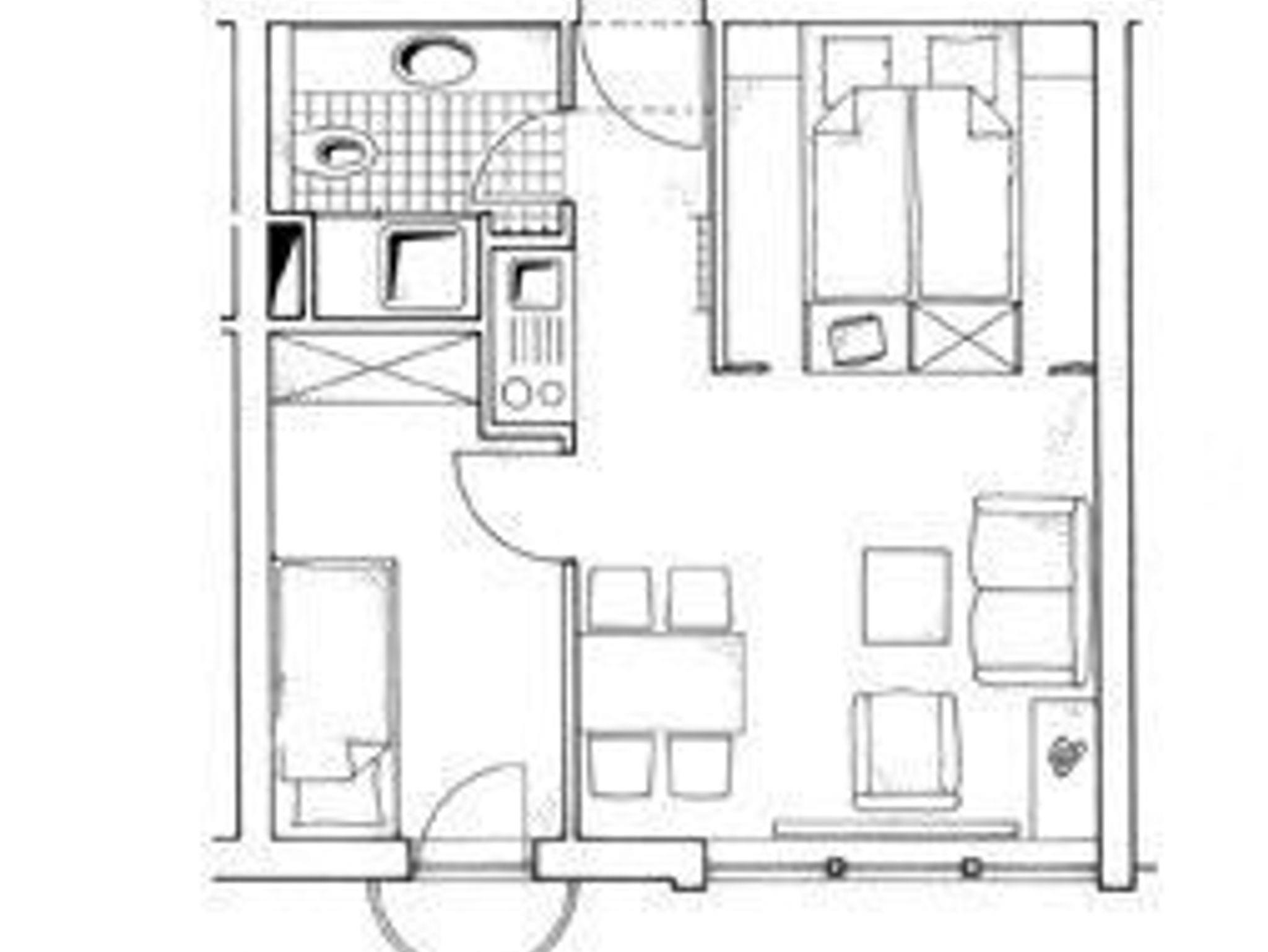 Schöne hell eingerichtete Ferienwohnung für 4 Personen im 1. Stock gelegen. Die Wohnung besteht aus einem Wohn/Ess/Schlafzimmer, wobei der Schlafbereich optisch vom Wohnraum getrennt ist. Hier steht ein 160x200 großes Doppelbett. Der Wohnbereich ist mit Sat-TV und einem Sofa ausgestattet und hat eine integrierte Pantryküche. Zusätzlich gibt es noch ein Kinderzimmer mit Etagenbett und ein helles Duschbad.