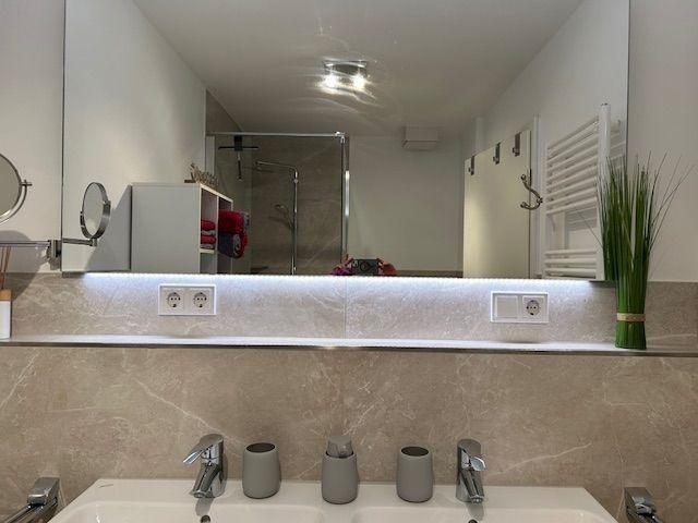 Das Badezimmer mit Doppelwaschbecken großer Dusche bietet viel Platz.