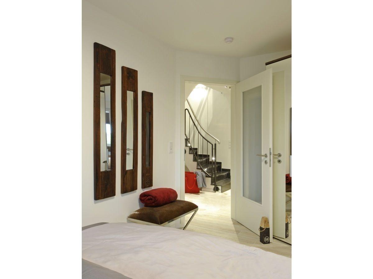 Vom Flur aus gelangen Sie über eine Treppe zu den drei Schlafzimmern, eines ist mit Boxspringbett, eines mit zwei Einzelbetten und eines mit Schlafcouch ausgestattet.