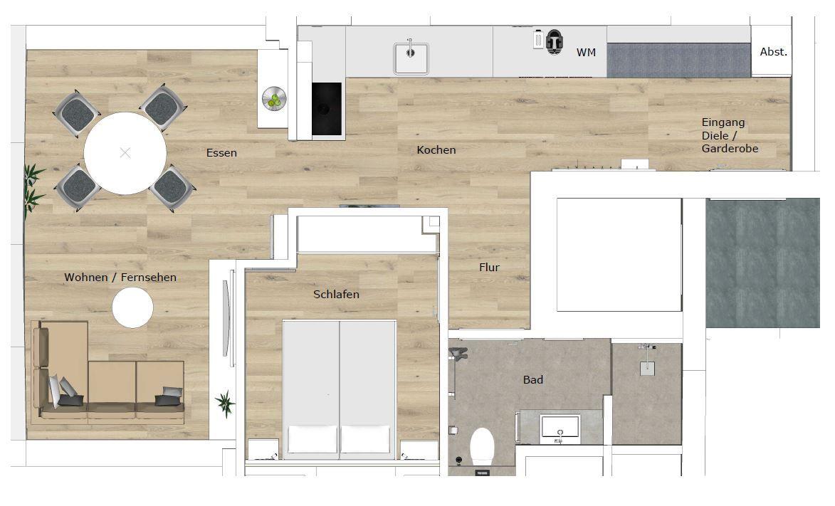 Der Wohnbereich lädt mit einer gemütlichen Sofaecke zum Entspannen und am Esstisch können Sie Ihre Mahlzeiten genießen. Ein Smart-TV sowie hochwertige SONOX Musikboxen garantieren Unterhaltung. Zum Surfen vom Smartphone aus empfangen Sie kostenlos freies WLAN.