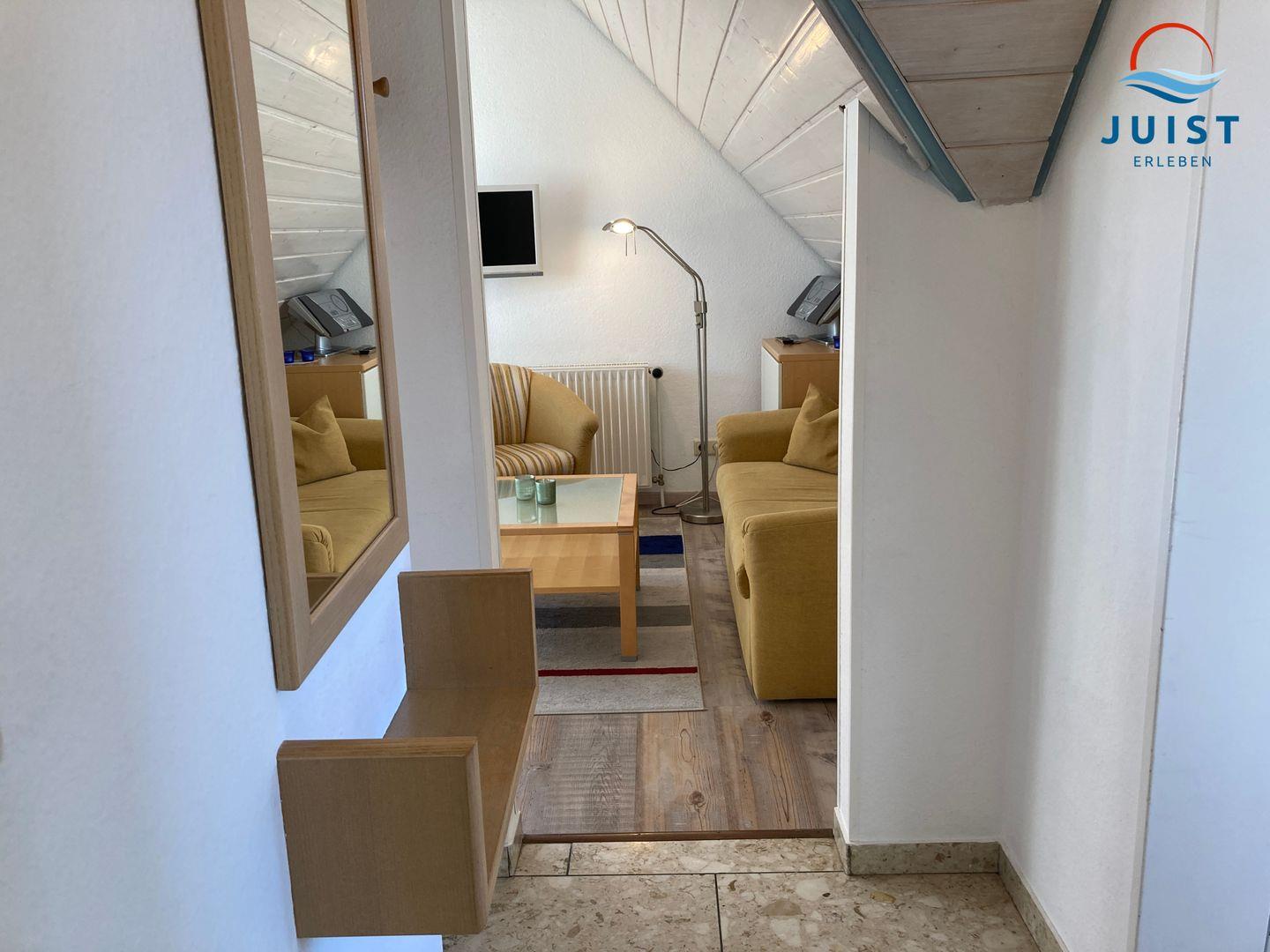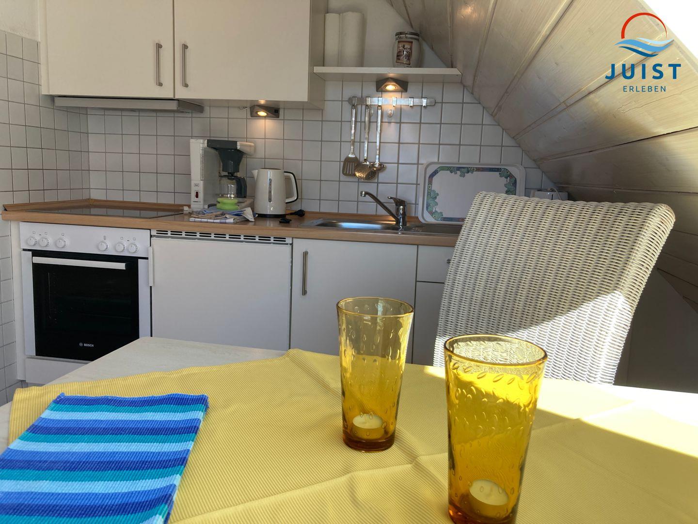Der gemütliche Wohnraum mit leichten Schrägen verfügt über eine Couch, einen Essbereich mit Blick aufs Wattenmeer und einer Küchenzeile.