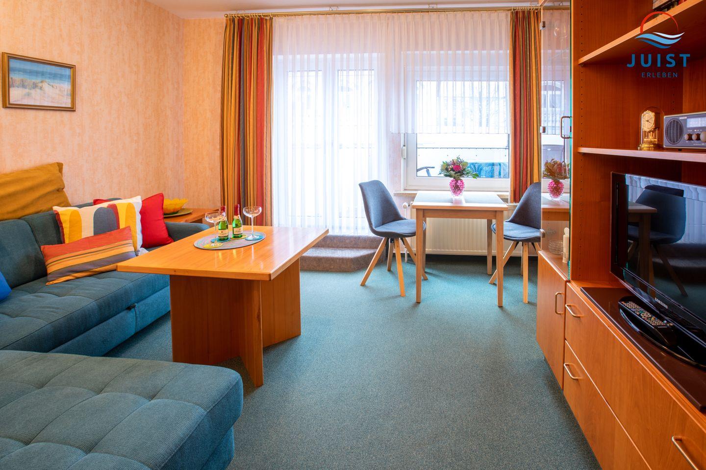 In dem Wohnraum erwartet Sie eine gemütliche Couchecke, in der Ihnen ein Fernseher und Radio zur Verfügung stehen. Vom Wohnraum aus gehen Sie auf den Süd-Balkon. Hier sind Ihnen jede Menge Sonnenstunden garantiert. Gemütliche Möbel machen den Balkon zu einem herrlichen Entspannungsort.