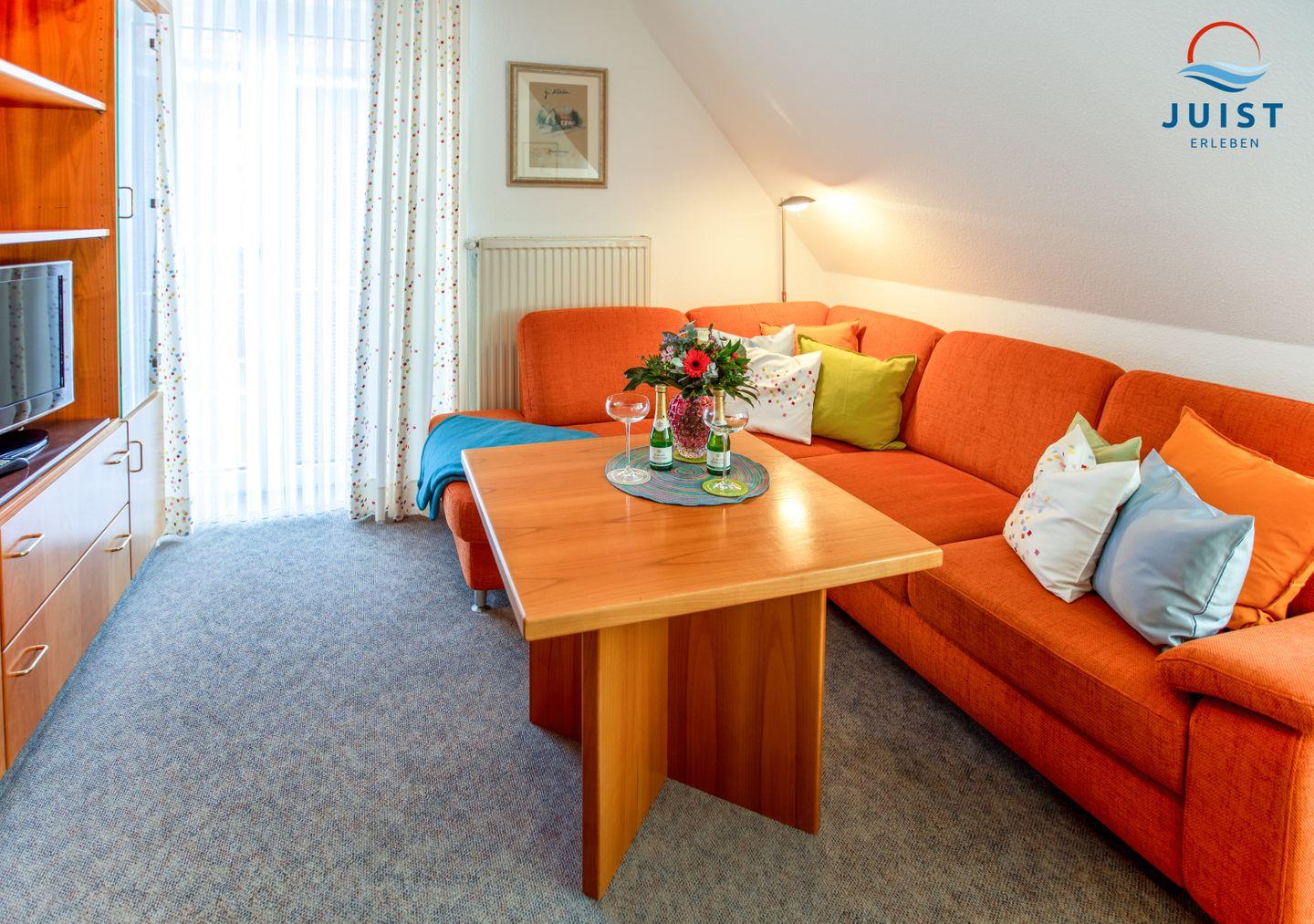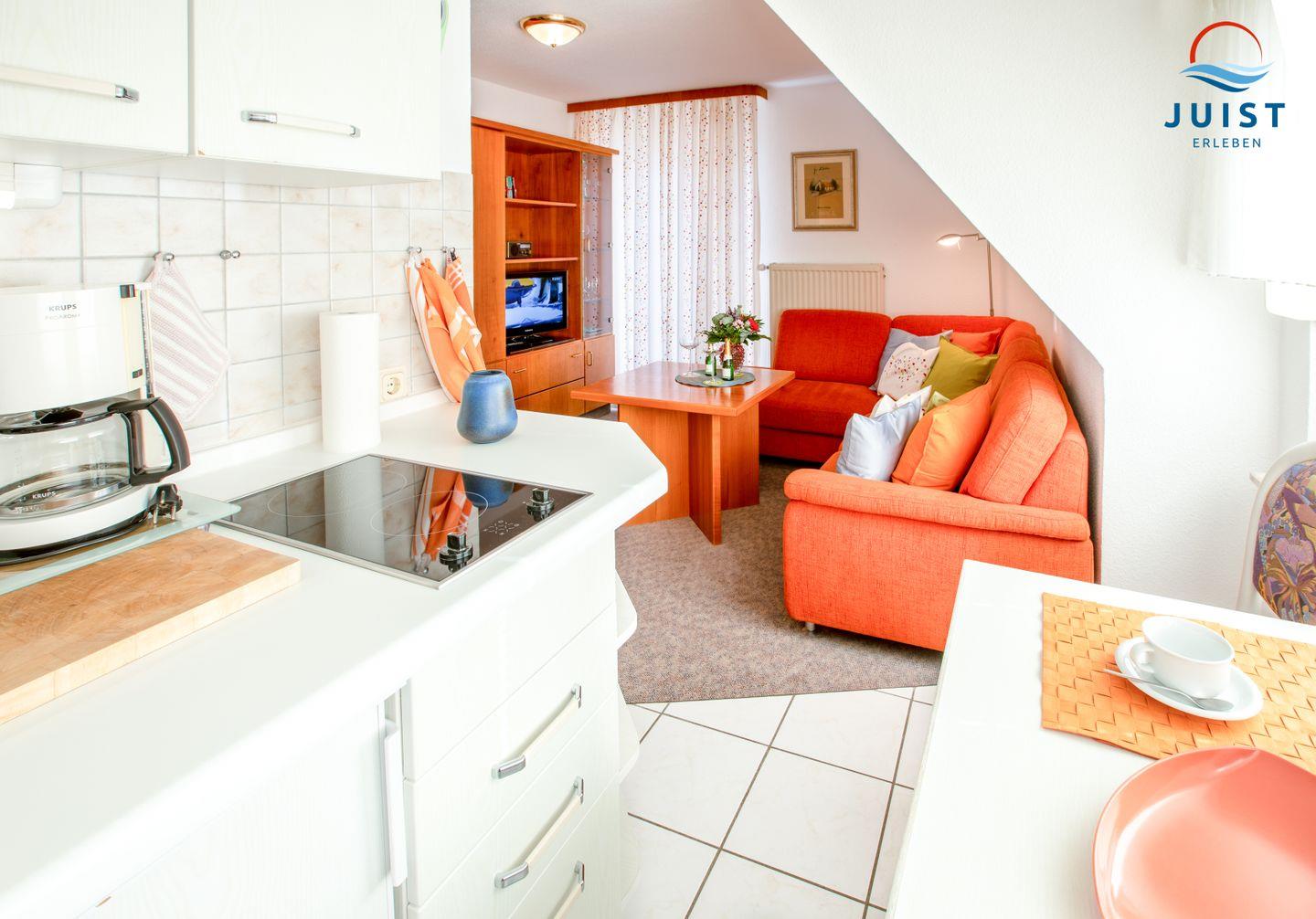 In dem Wohnraum erwartet Sie eine gemütliche Couchecke, in der Ihnen ein Fernseher und Radio zur Verfügung stehen. Hier integriert ist eine Pantryküche mit Essbereich. Eine Spüle, 2-Platten-Ceranfeld und ein Kühlschrank sowie Wasserkocher, Toaster und Kaffeemaschine ermöglichen Ihnen eine angenehme Selbstverpflegung.