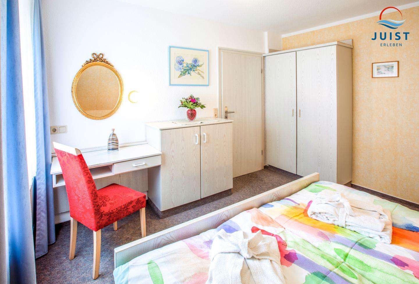 Im Schlafzimmer befindet sich ein bequemes Doppelbett, ein kleiner Tisch mit Stuhl sowie ein großer Kleiderschrank. Von hier aus gelangen sie ins Badezimmer mit Dusche.