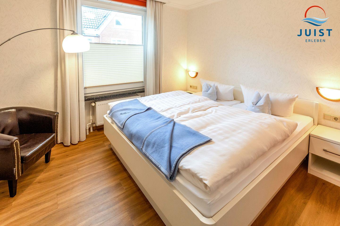In dem separaten Schlafzimmer der Ferienwohnung befindet sich ein komfortables Doppelbett,