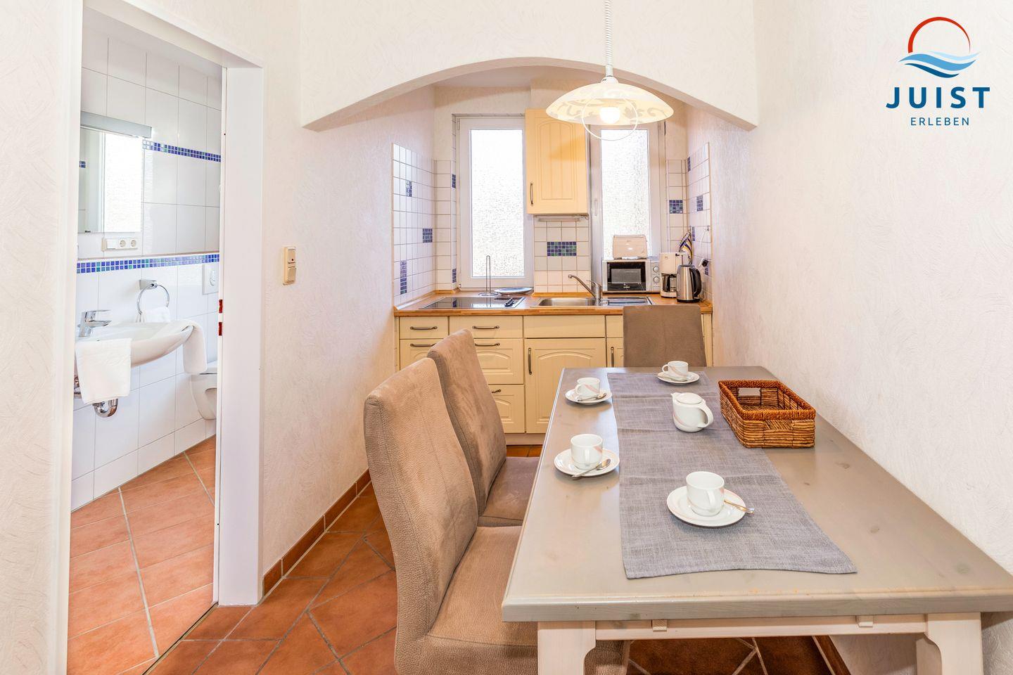 Damit Sie sich in Ihrem Urlaub auf Juist bequem selbst verpflegen können, verfügt die Küchenzeile u.a. über einen Herd, einen Kühlschrank und eine Mikrowelle sowie über eine Kaffeemaschine, einen Wasserkocher und einen Toaster.
