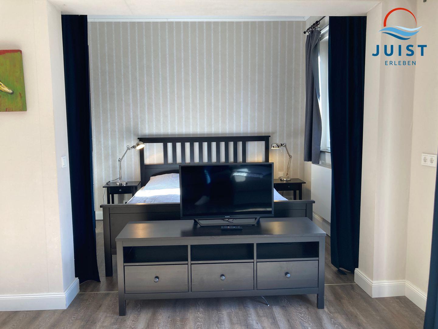 Im Schlafbereich der Juister Ferienwohnung befindet sich ein großer Kleiderschrank und ein komfortables Doppelbett für 2 Personen.