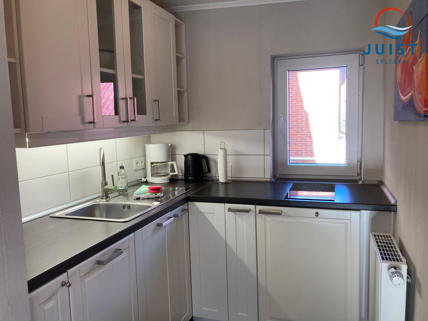 Damit Sie sich in Ihrem Urlaub auf Juist angenehm selbst verpflegen können, verfügt die Ferienwohnung über eine gut ausgestattete Küchenzeile - u.a. mit 2-Plattenherd und Kühlschrank mit Gefrierfach sowie Mikrowelle mit Backofenfunktion, Spülmaschine, Kaffeemaschine, Wasserkocher und Toaster.
