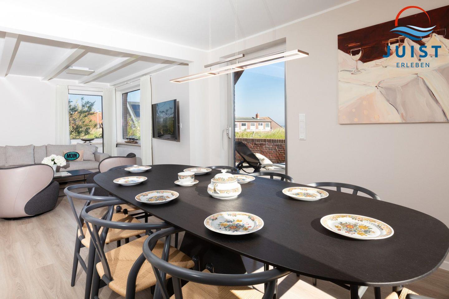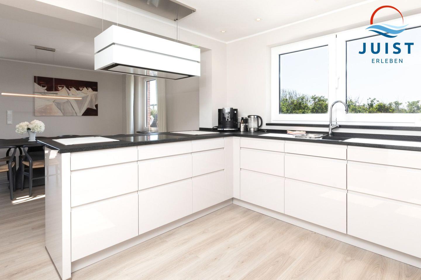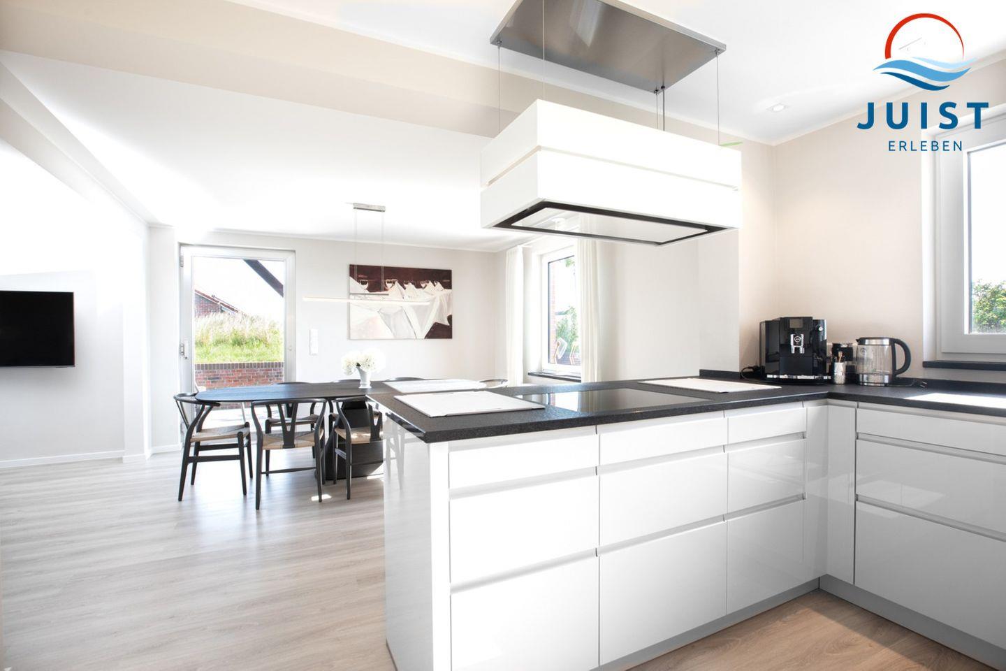 Die moderne luxuriöse Küchenausstattung umfasst unter anderem einen Induktionsherd, Backofen, Geschirrspüler, Kühlschrank, Kaffeemaschine, Wasserkocher und Toaster - so können Sie auch im Urlaub schnell und einfach köstliche Gerichte zubereiten. Alternativ können Sie sich auch in einem der vielen Restaurants auf Juist verwöhnen lassen, die eine delikate Nordseeküche mit Meerblick servieren.