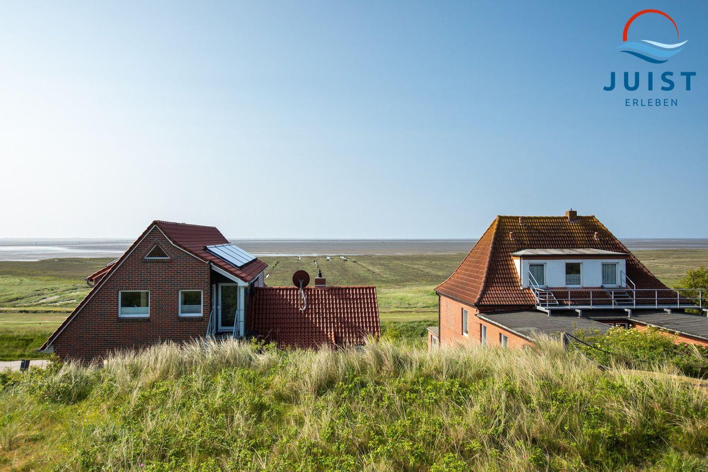 Sonne und frische Nordseeluft können Sie gleich mitbuchen! Das Ferienhaus verfügt über einen Balkon im ersten Stock sowie eine möblierte Terrasse rund um das Haus. Hier haben Sie eine traumhaften Blick aufs Wattenmeer. So können Sie zu jeder Tageszeit die Sonne genießen. Die private Abgeschiedenheit garantiert Ihnen Entspannung in ruhiger und erholsamer Urlaubsatmosphäre.