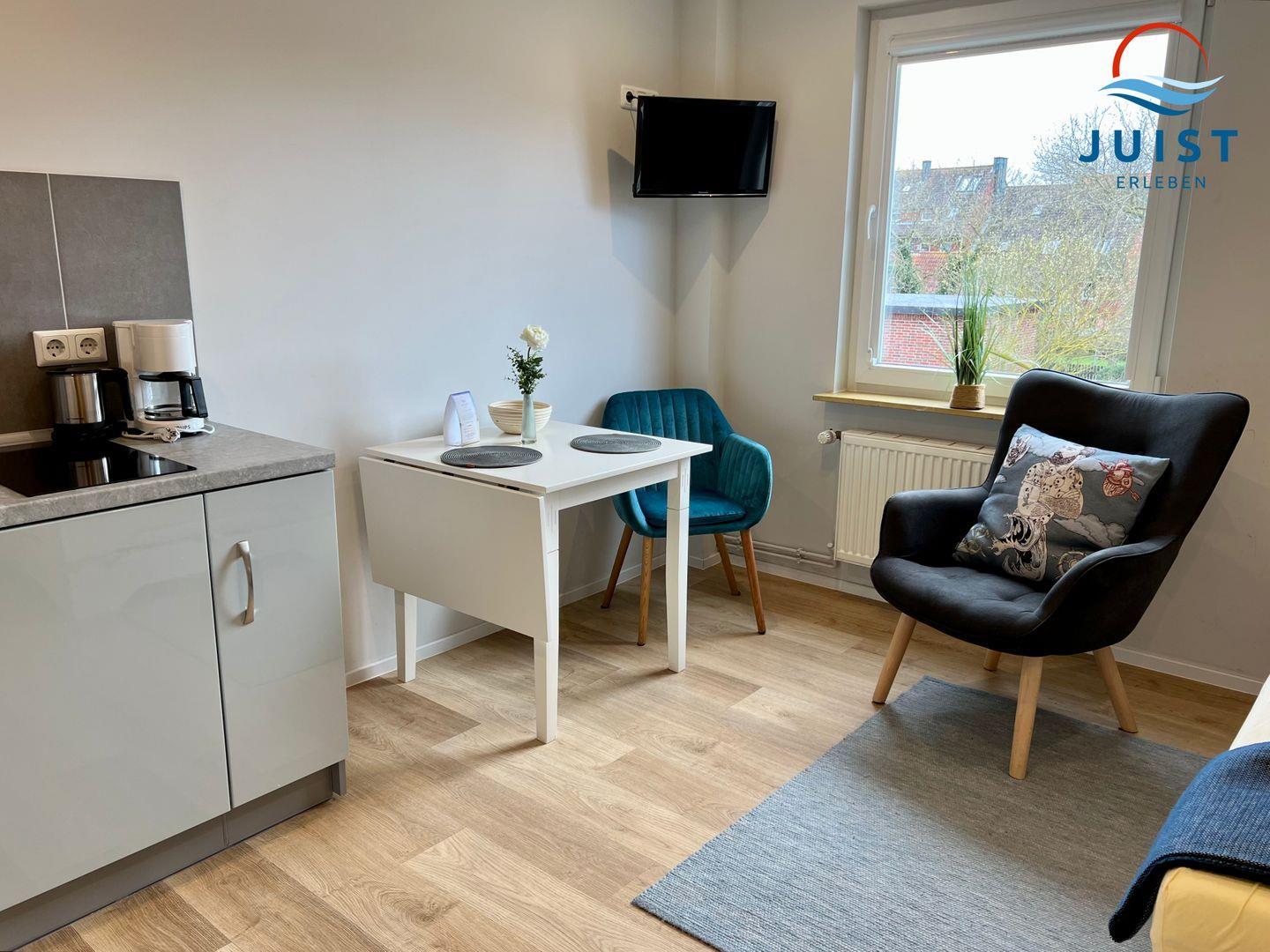 In der Wohnung kleine Kajüte erwarten Sie ein gemütlicher Wohn- Schlafraum mit Fernseher, integrierter Küche und Essbereich.