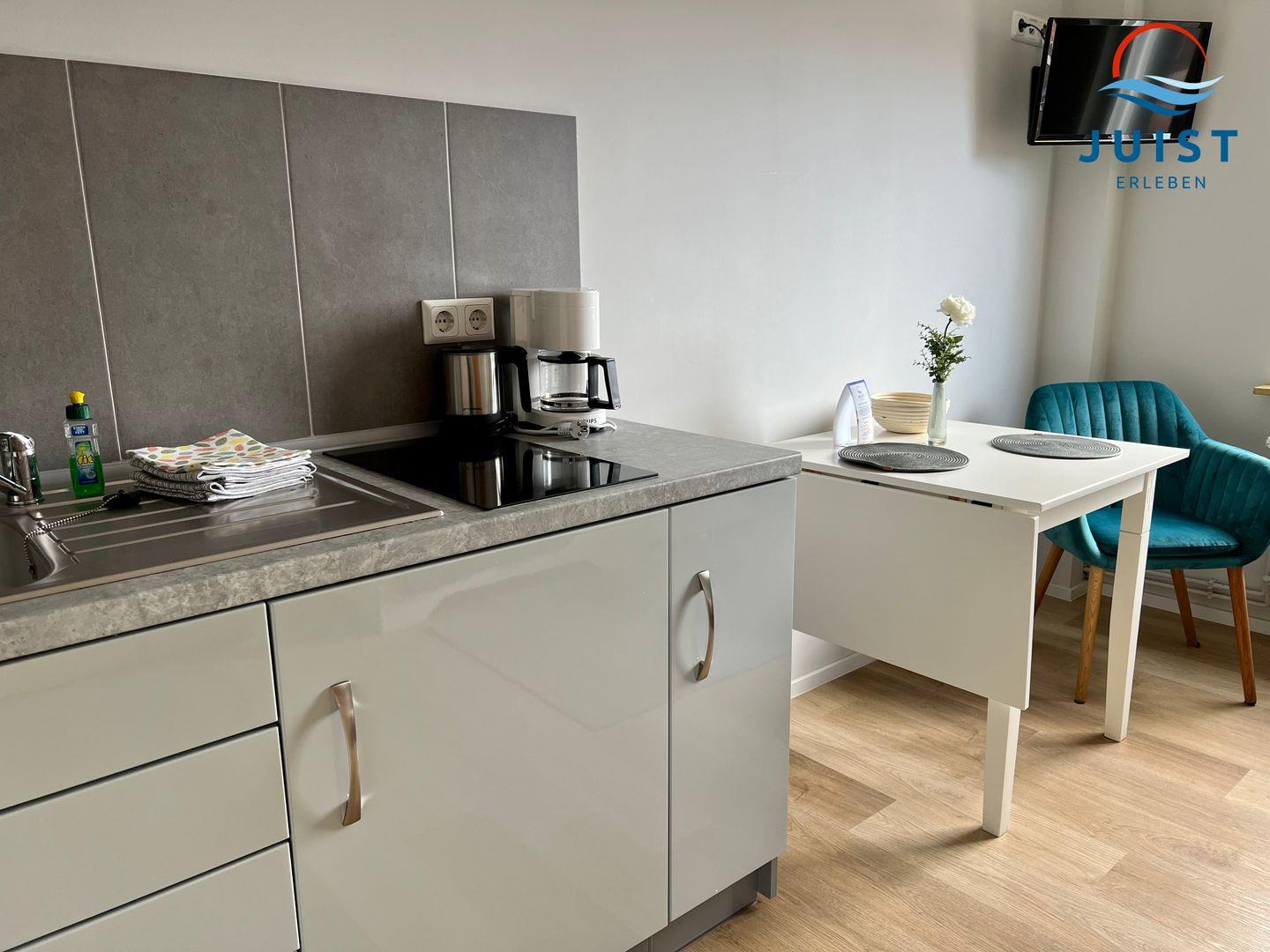 Damit Sie sich in Ihrem Urlaub auf Juist bequem selbst verpflegen können, verfügt die Küchenzeile u.a. über einen Herd, einen Kühlschrank und eine Mikrowelle mit Backofenfunktion sowie über eine Kaffeemaschine, Wasserkocher und Toaster.