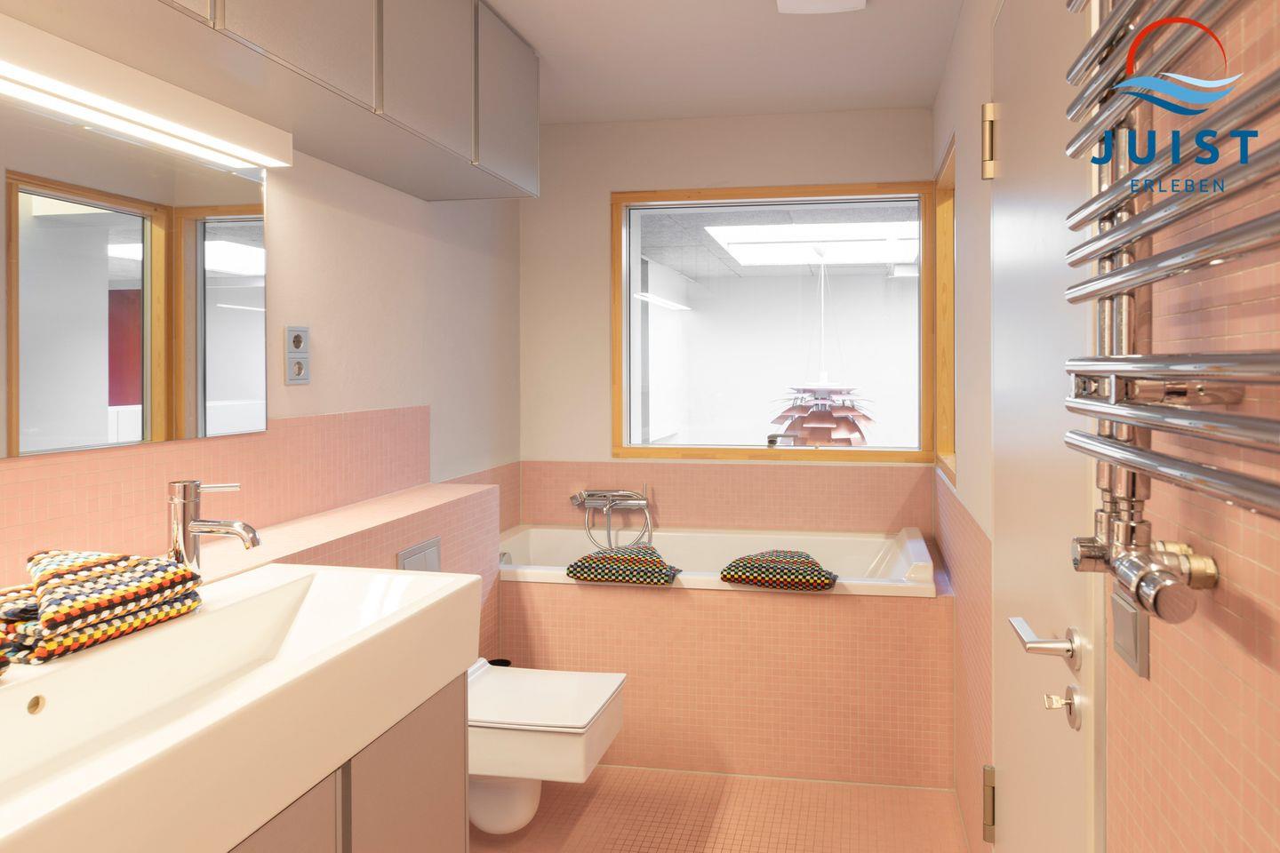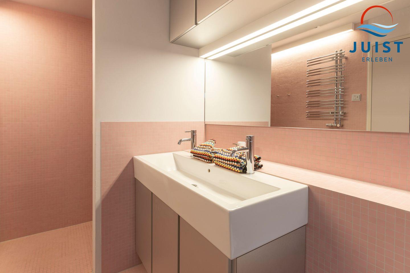 Gegenüber liegt das moderne Badezimmer mit einer offnen Dusche sowie Badewanne zum Entspannen.