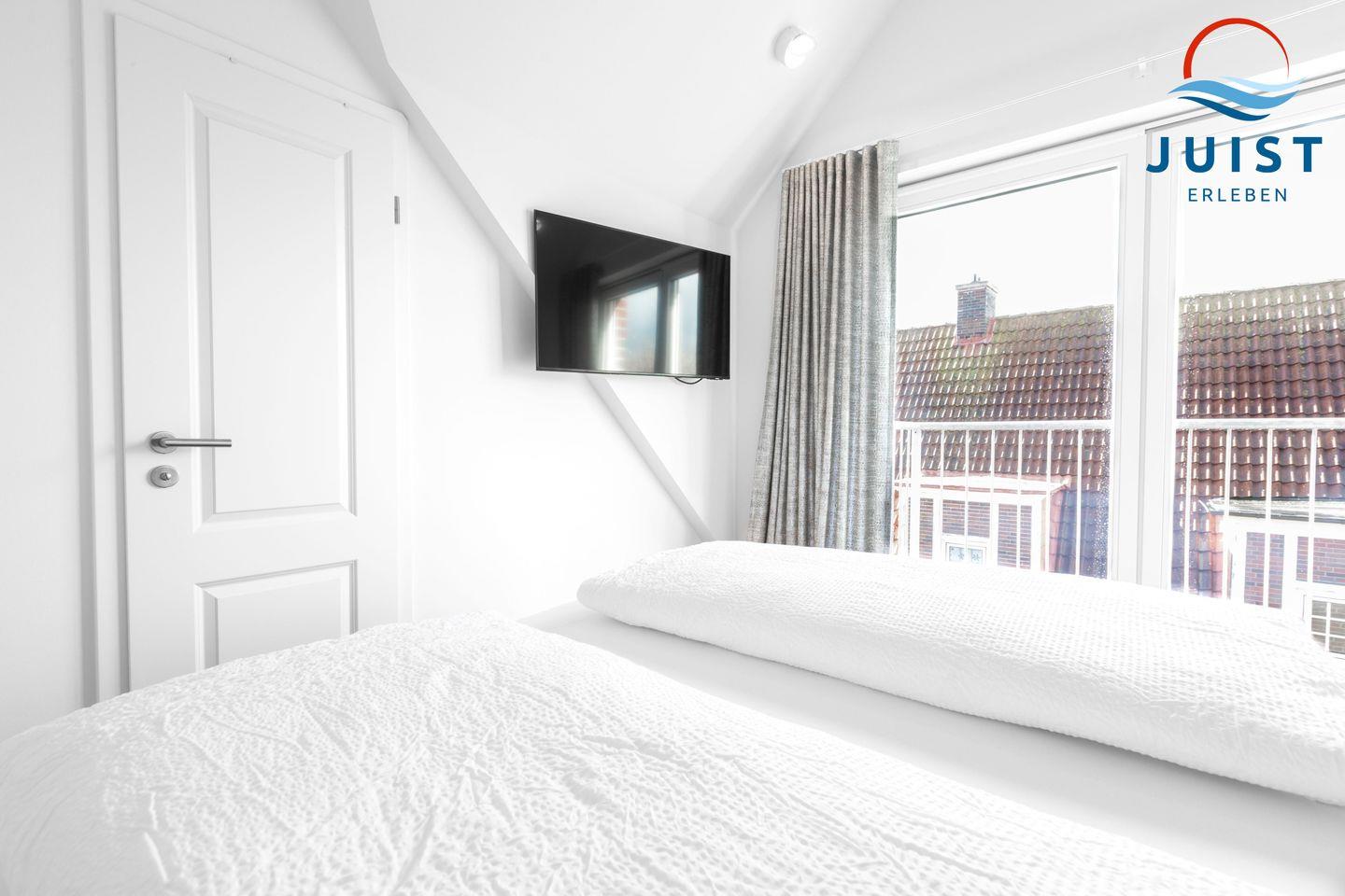 Die zwei separaten Schlafzimmer sind mit einem Doppelbett und einem TV sowie Kleiderschrank eingerichtet.